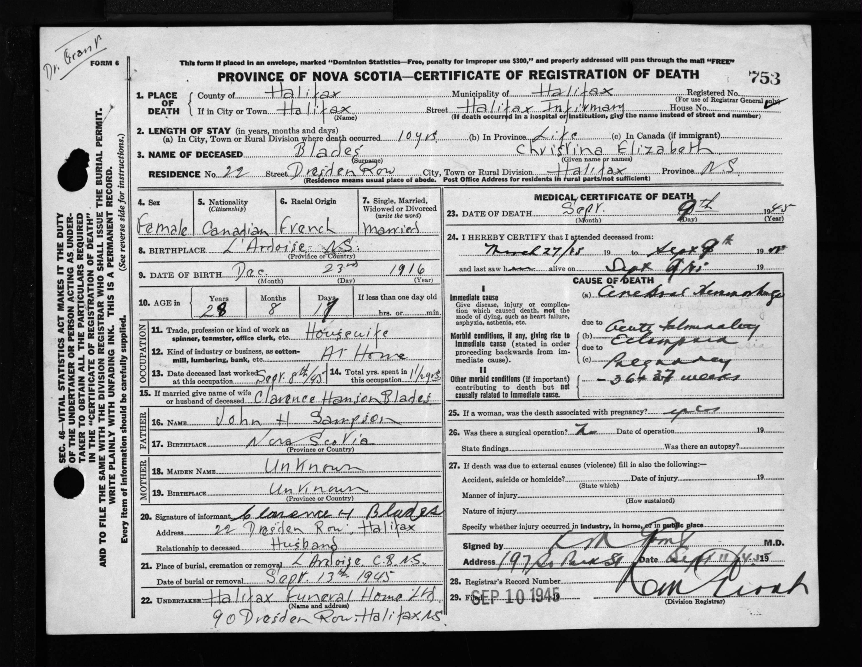 Death Registration: Year: 1945 file: 220 number: 753