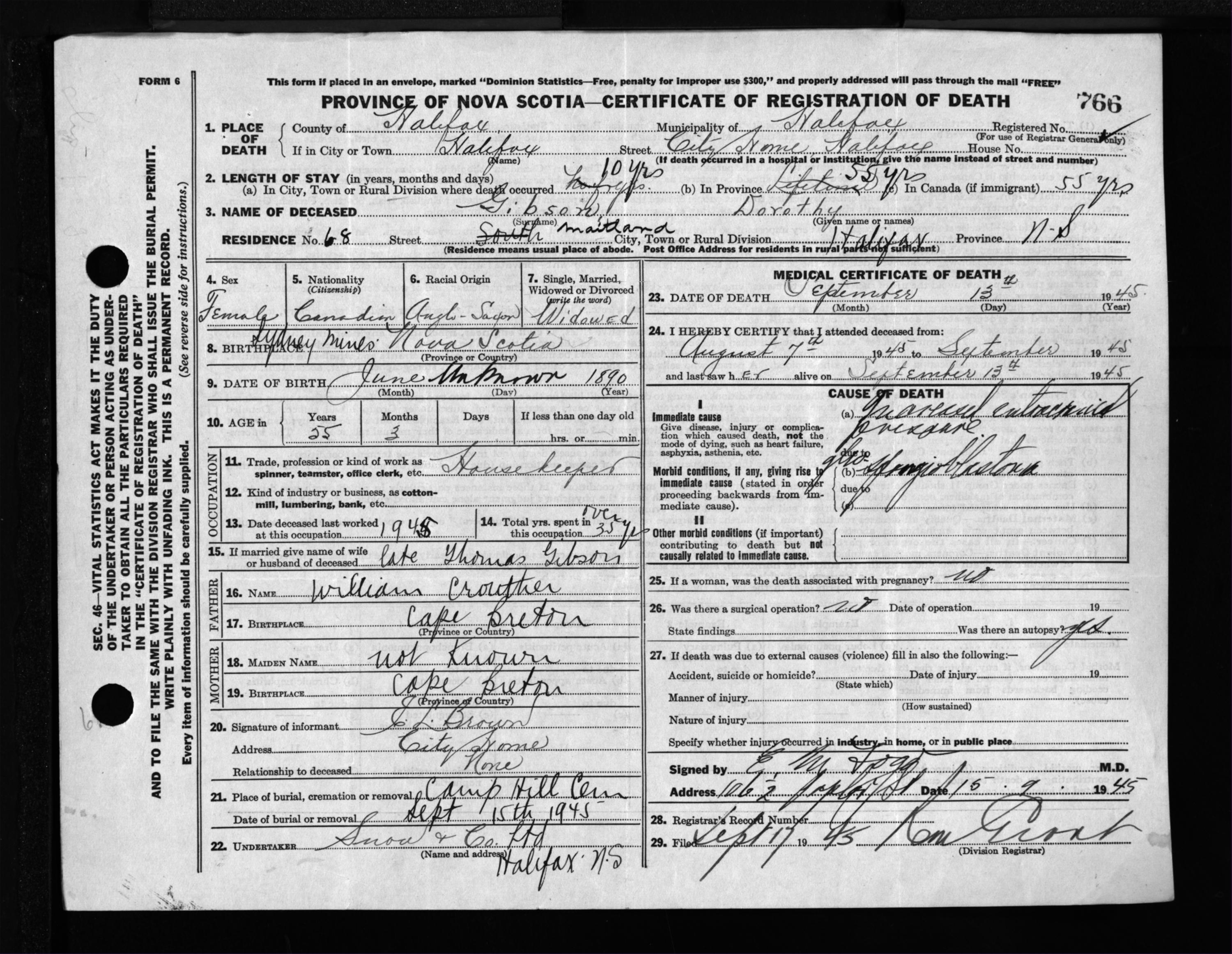 Death Registration: Year: 1945 file: 220 number: 766