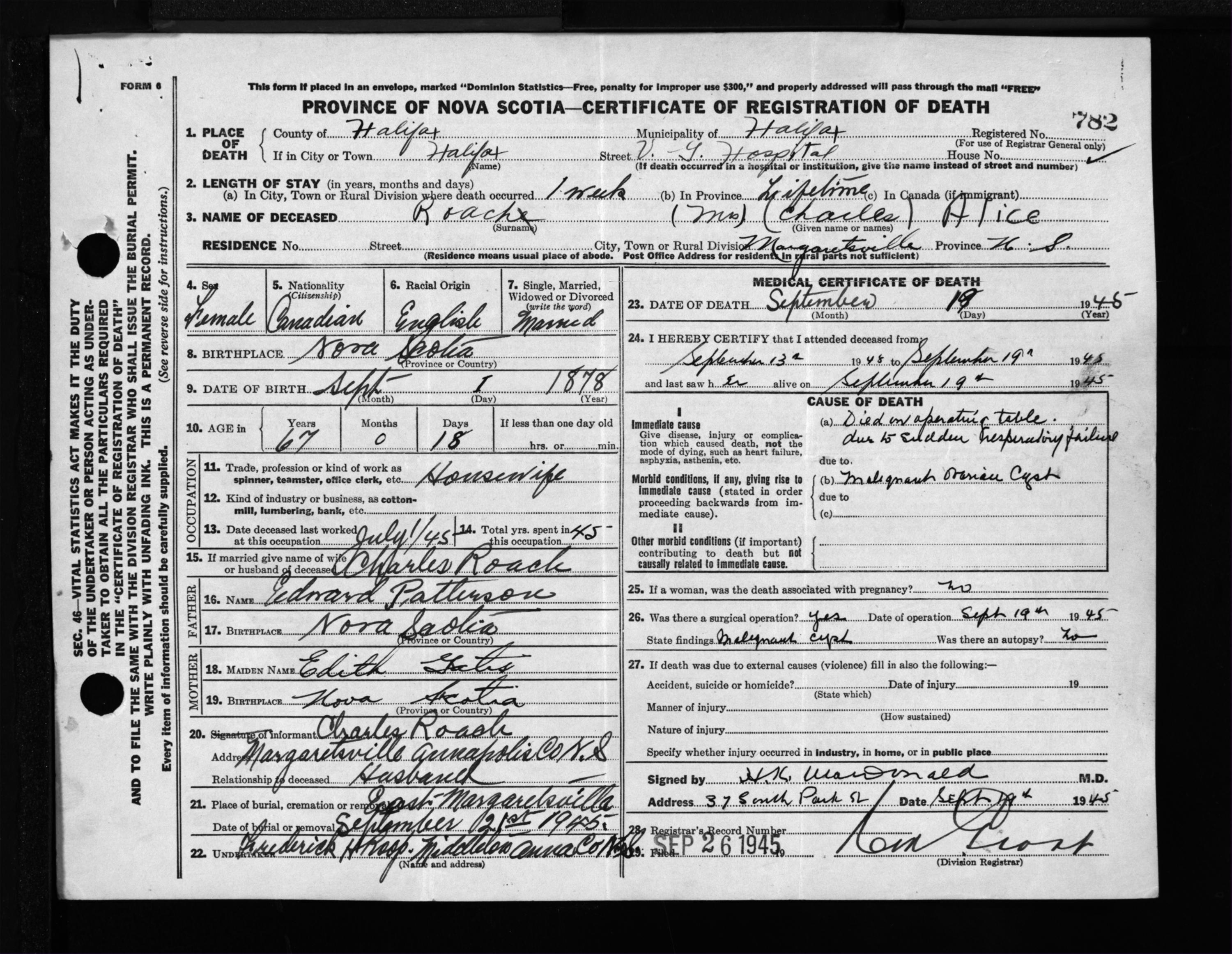 Death Registration: Year: 1945 file: 220 number: 782