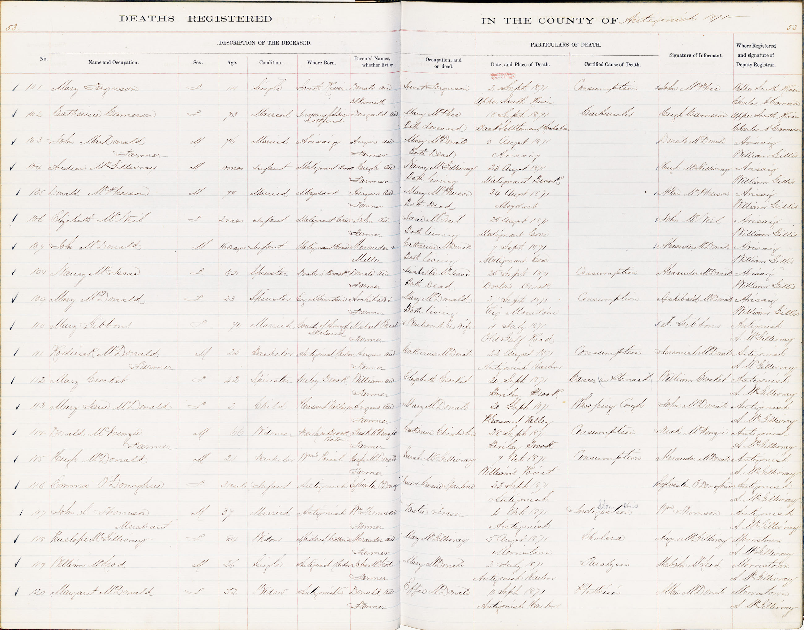 Death Registration: Year: 1871 book: 1802 page: 53 number: 120