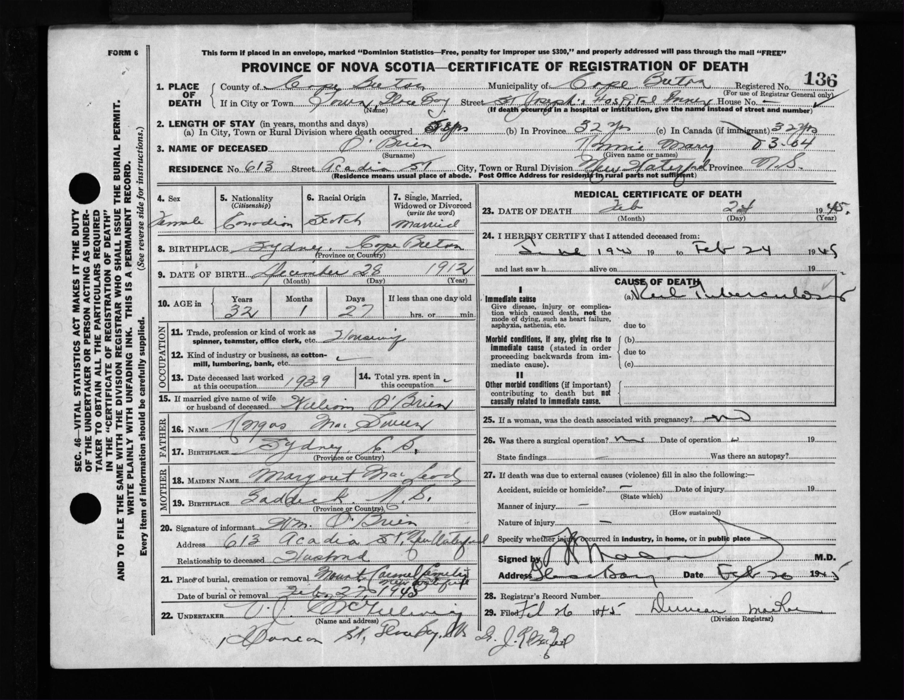 Female Death Registration: Year: 1945 file: 222 number: 136