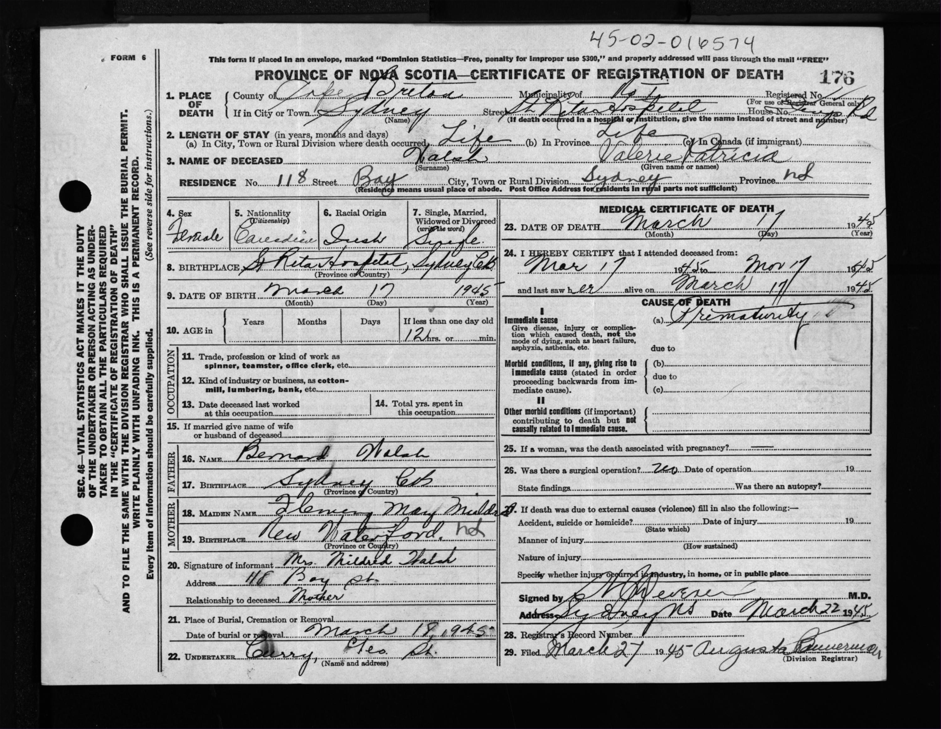 Female Death Registration: Year: 1945 file: 222 number: 176