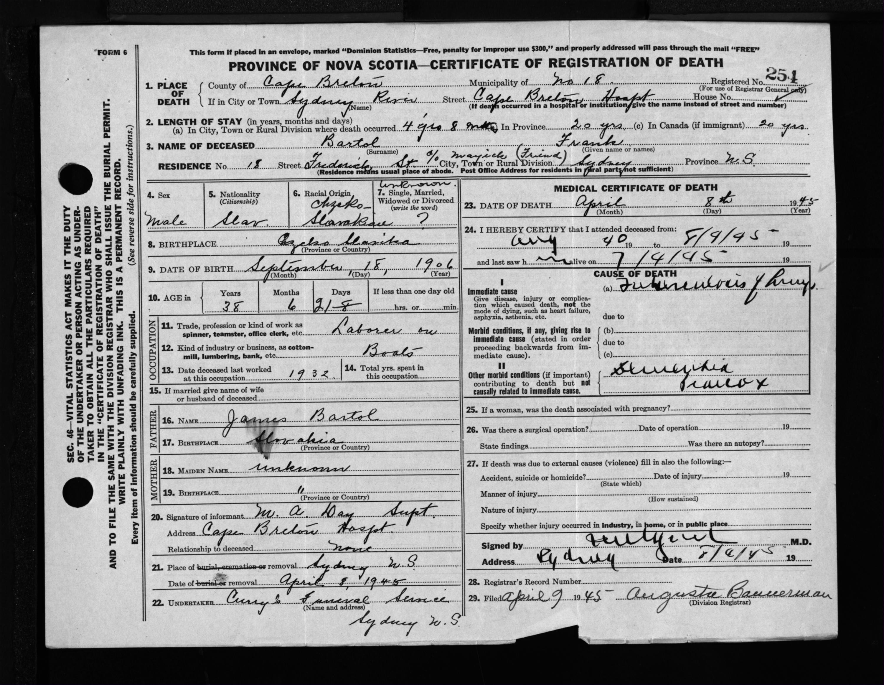 Male Death Registration: Year: 1945 file: 222 number: 254
