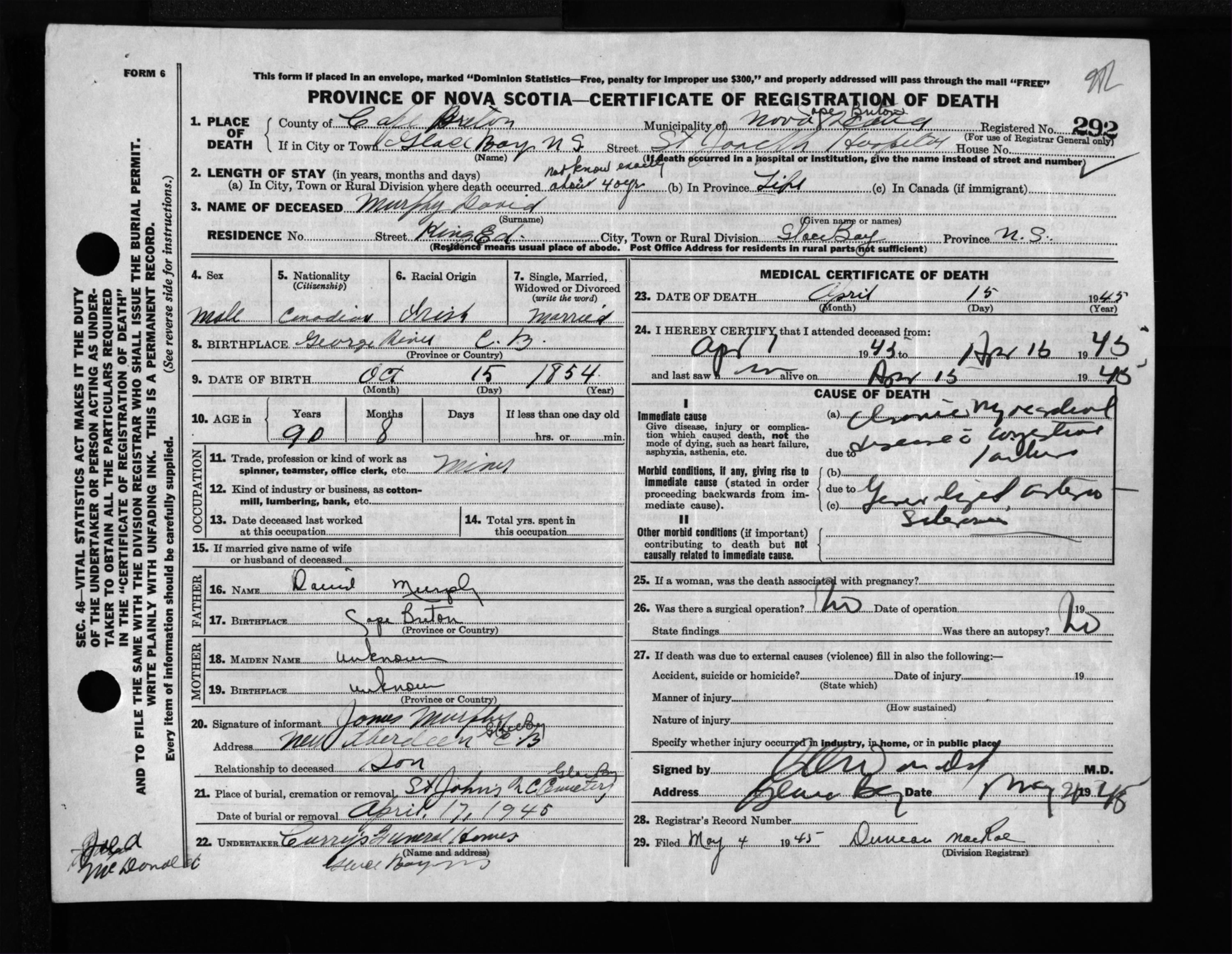 Male Death Registration: Year: 1945 file: 222 number: 292