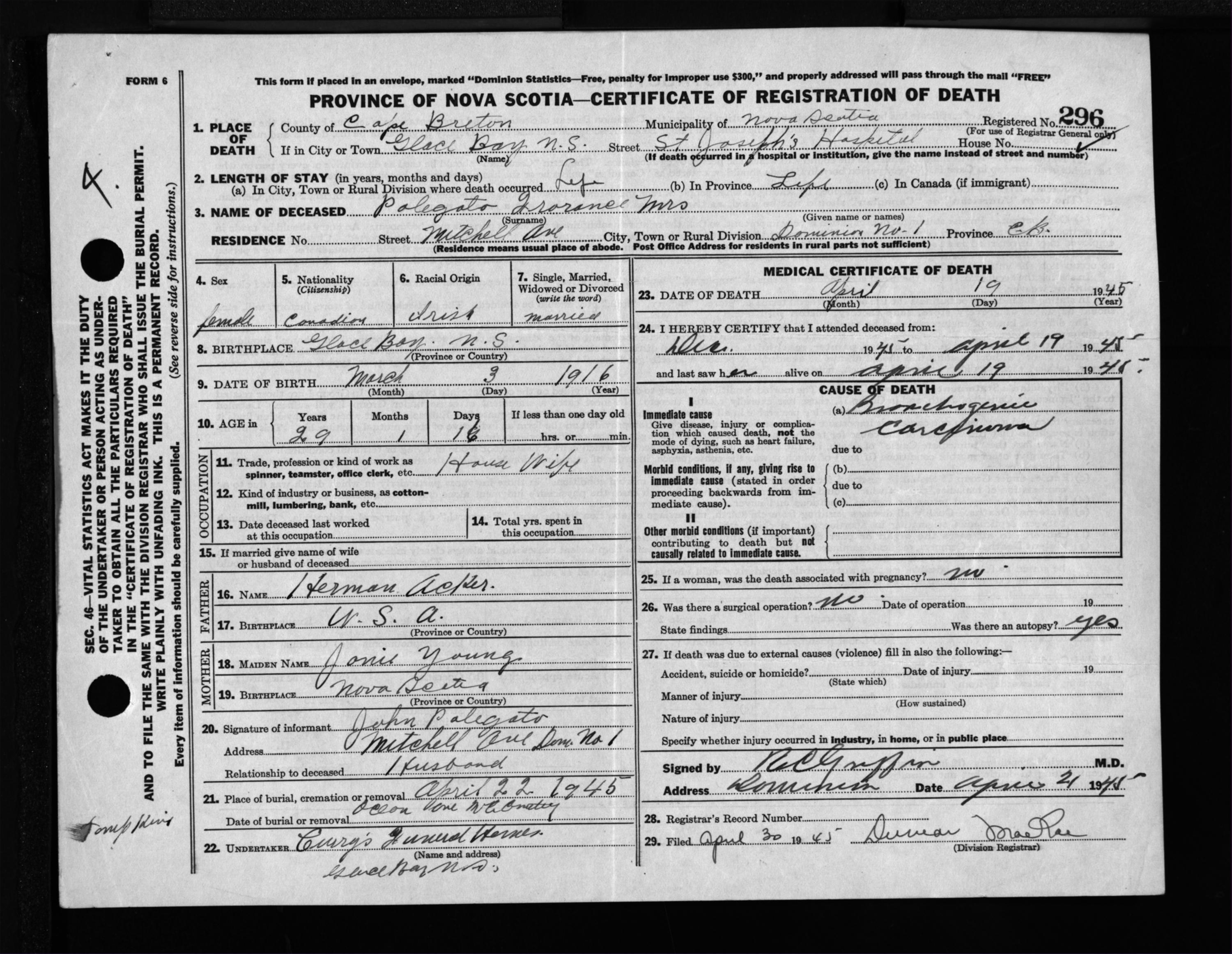 Female Death Registration: Year: 1945 file: 222 number: 296
