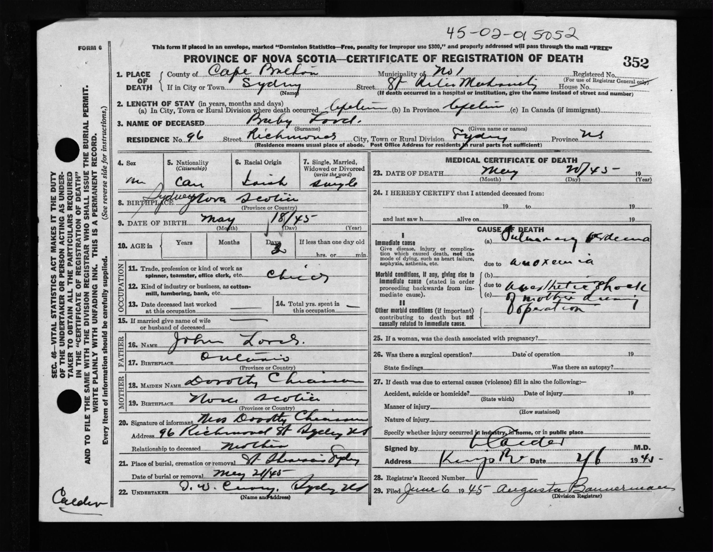 Male Death Registration: Year: 1945 file: 222 number: 352