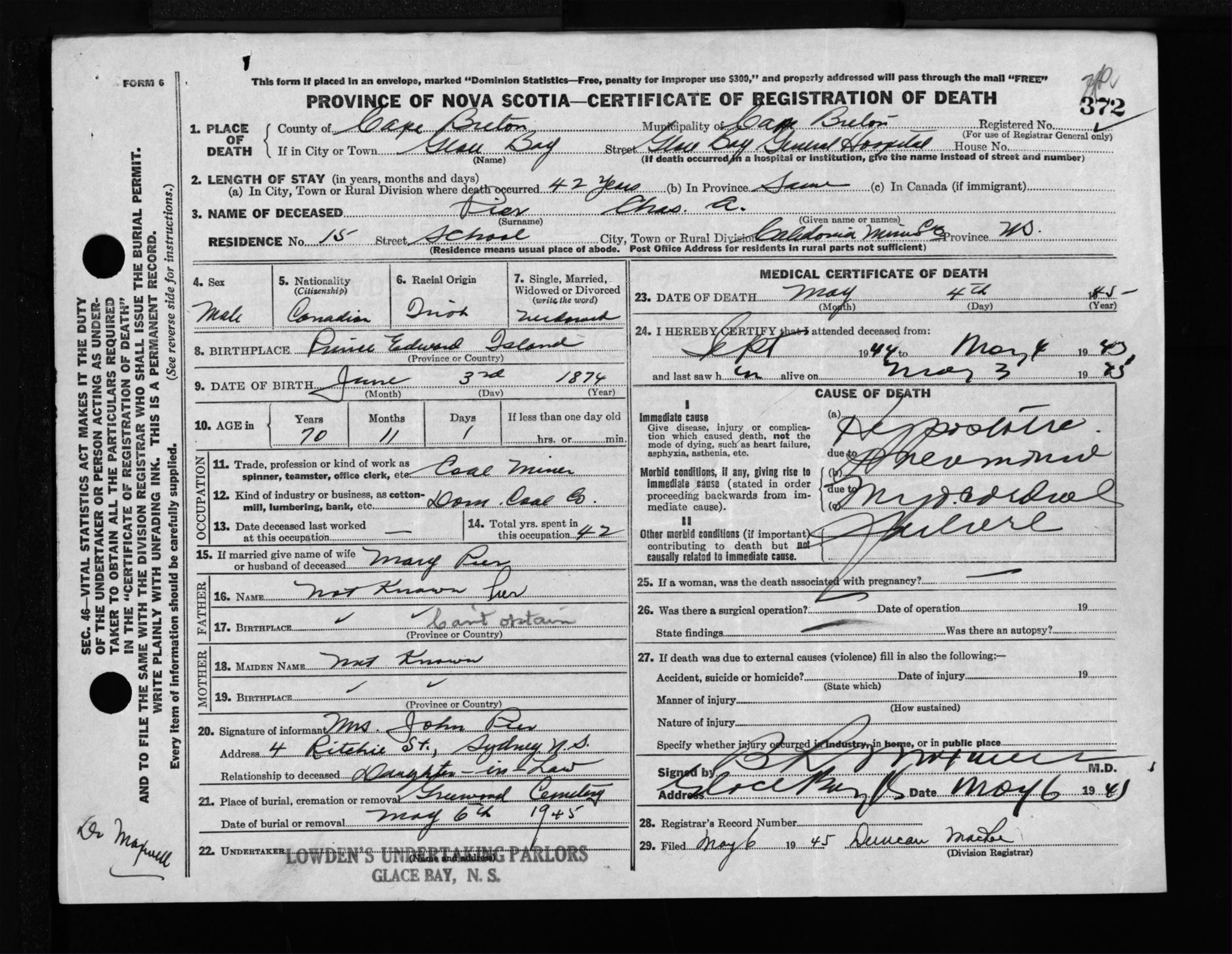 Male Death Registration: Year: 1945 file: 222 number: 372