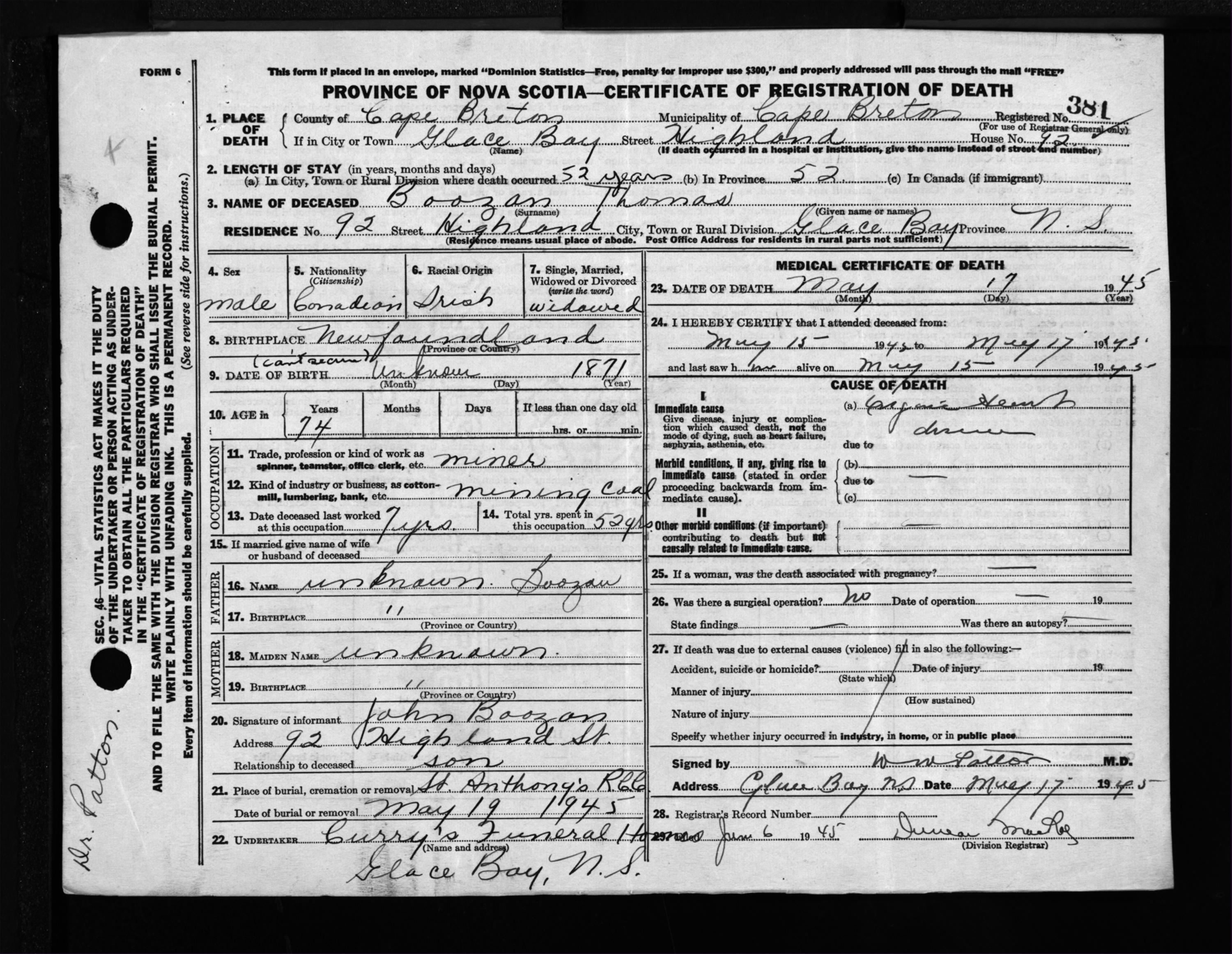 Male Death Registration: Year: 1945 file: 222 number: 381