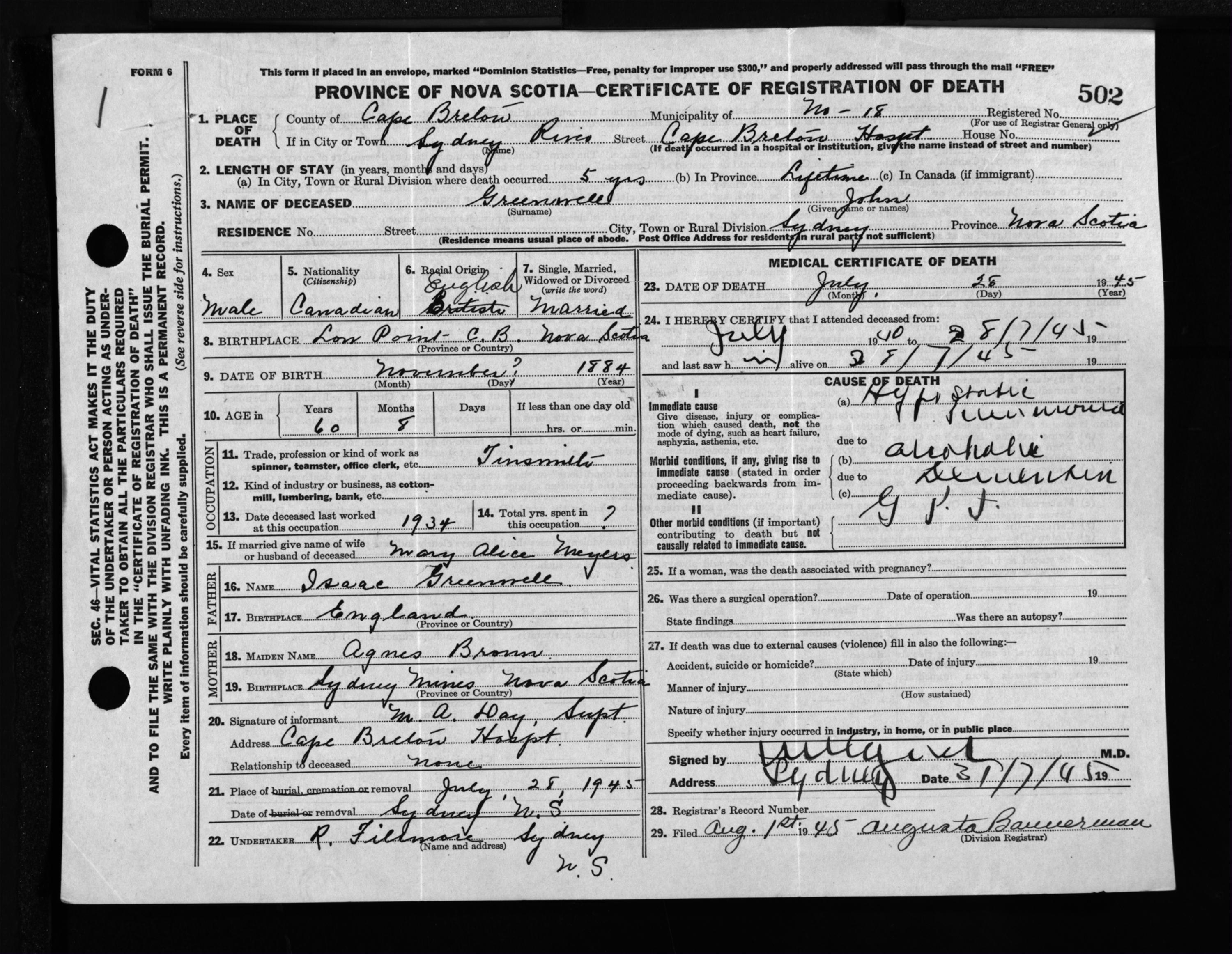 Male Death Registration: Year: 1945 file: 222 number: 502