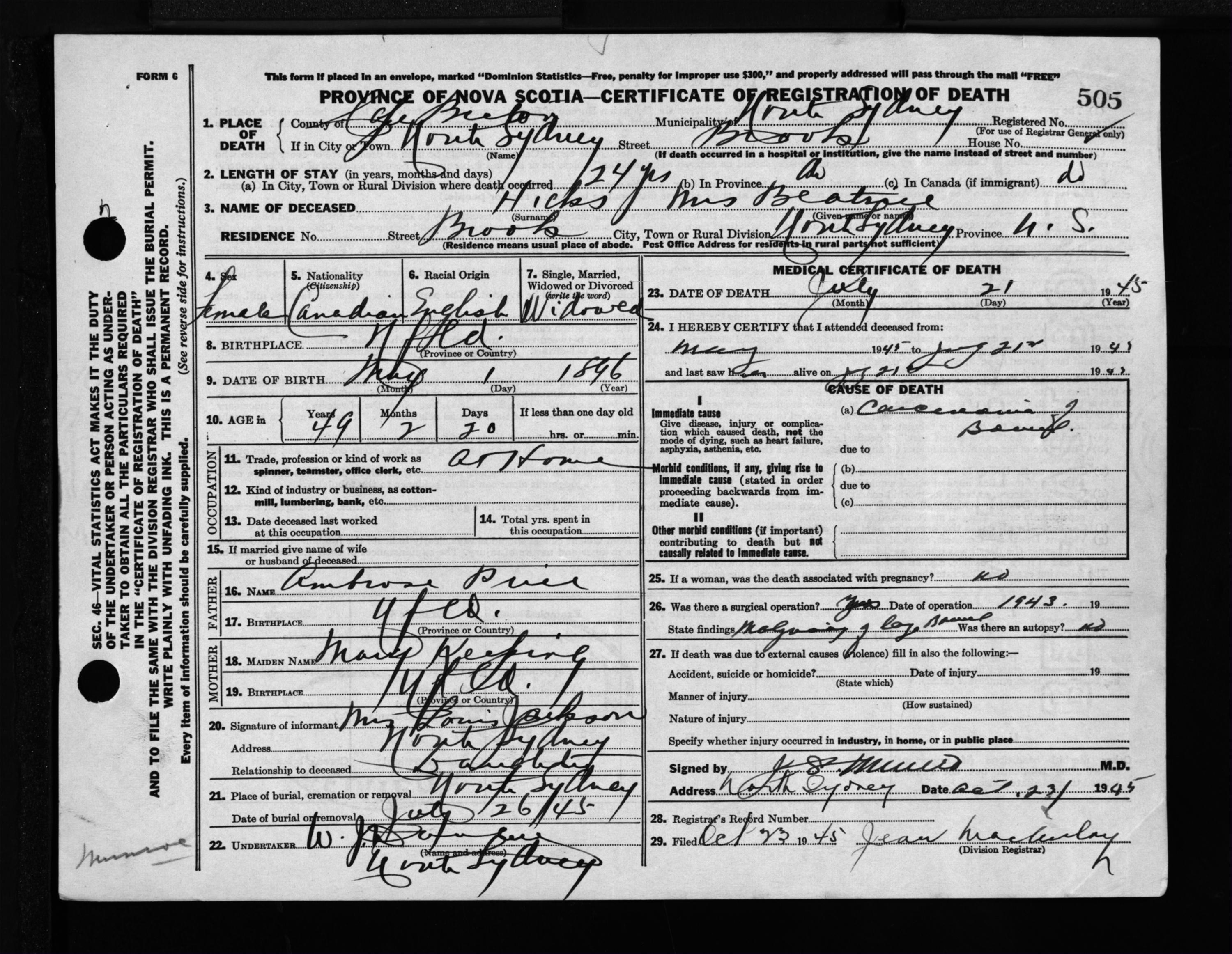 Female Death Registration: Year: 1945 file: 222 number: 505