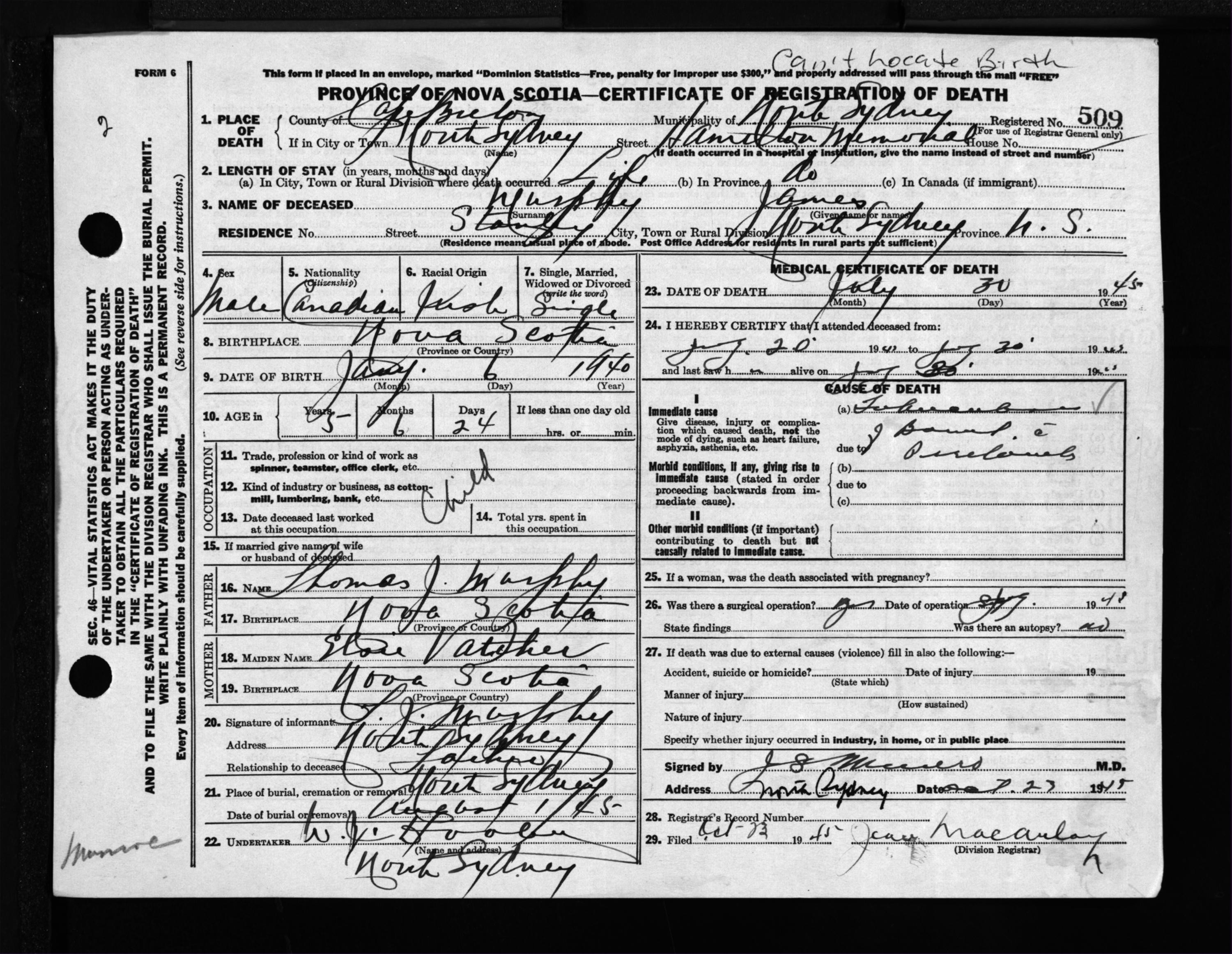 Male Death Registration: Year: 1945 file: 222 number: 509