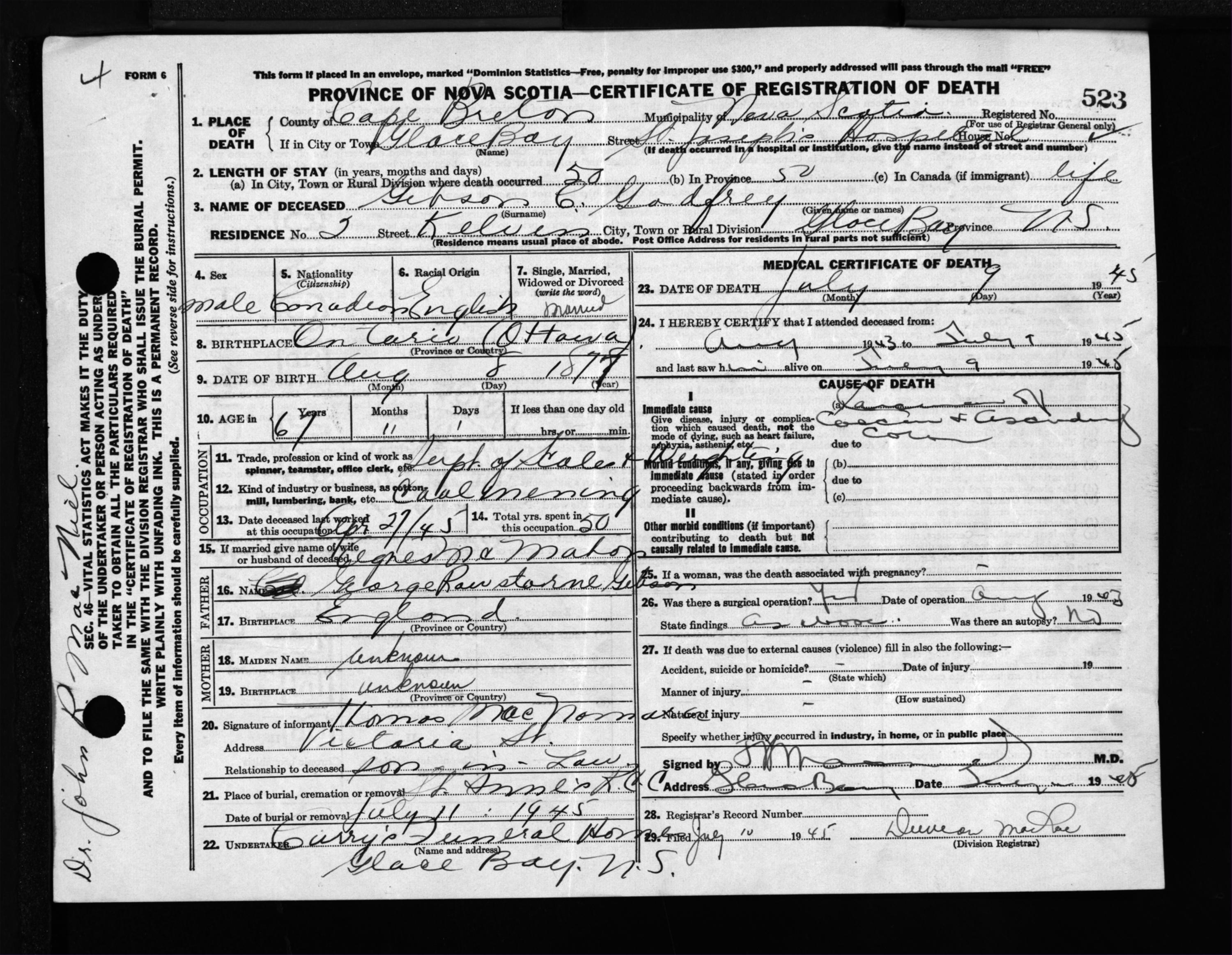 Male Death Registration: Year: 1945 file: 222 number: 523