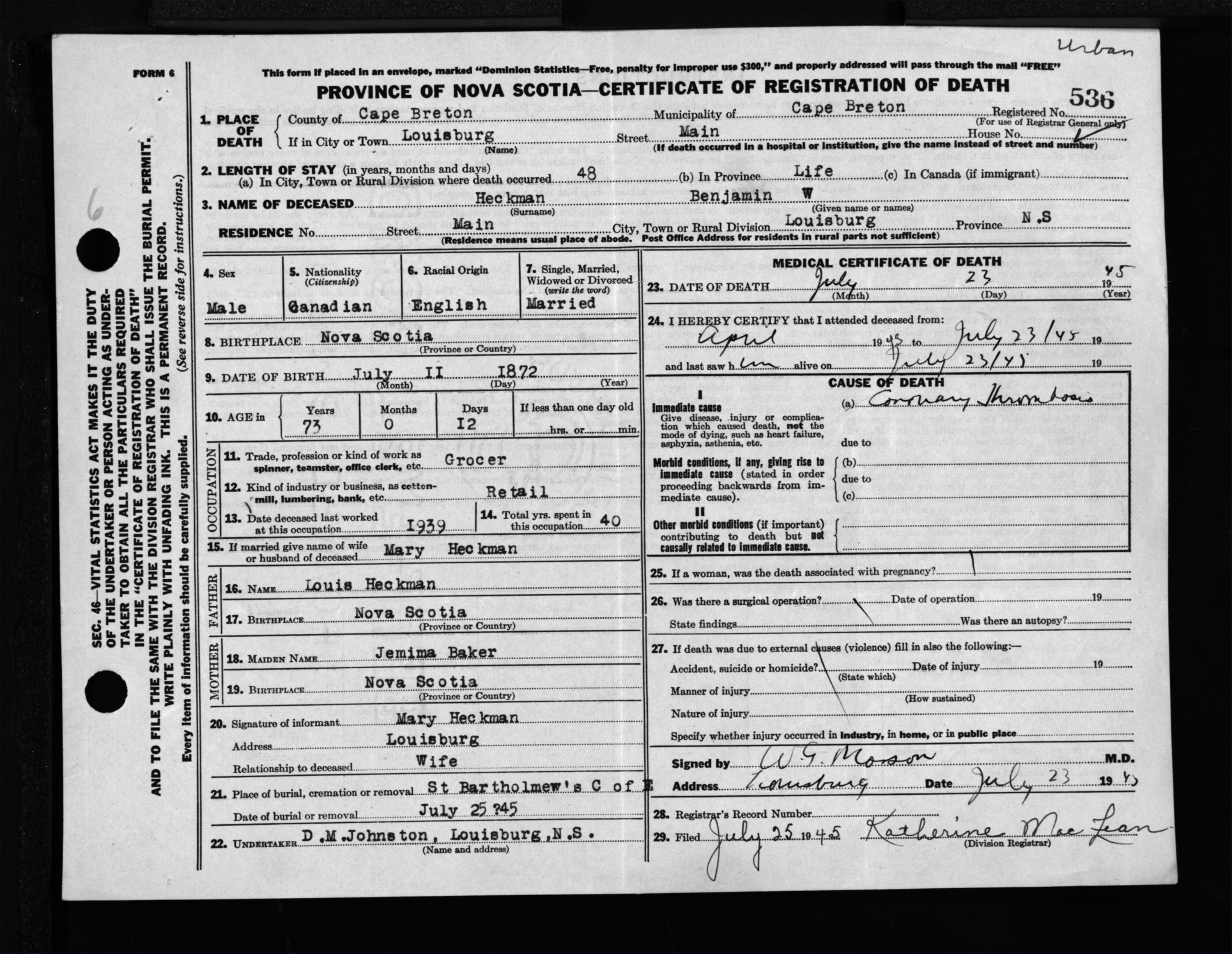 Male Death Registration: Year: 1945 file: 222 number: 536