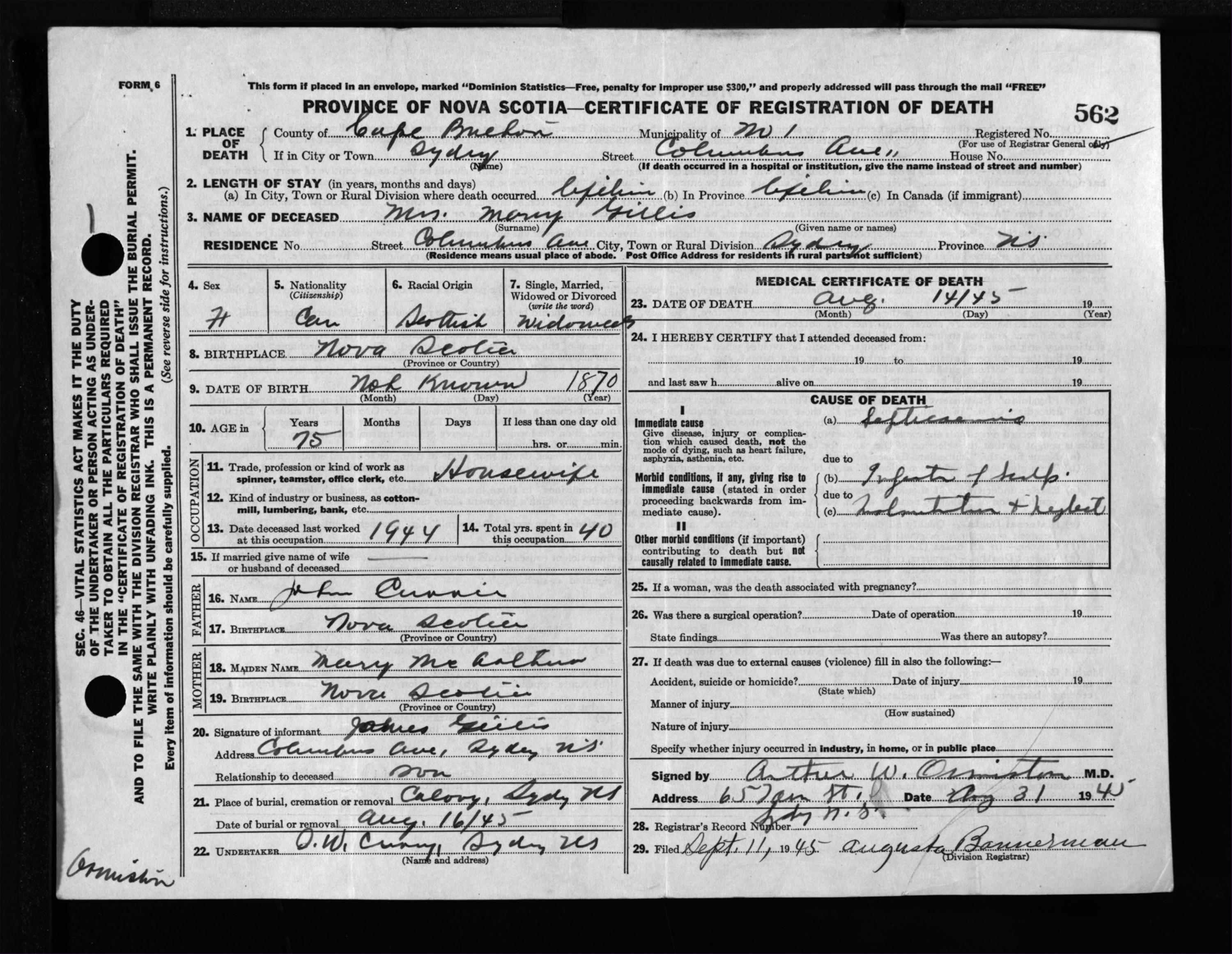 Female Death Registration: Year: 1945 file: 222 number: 562