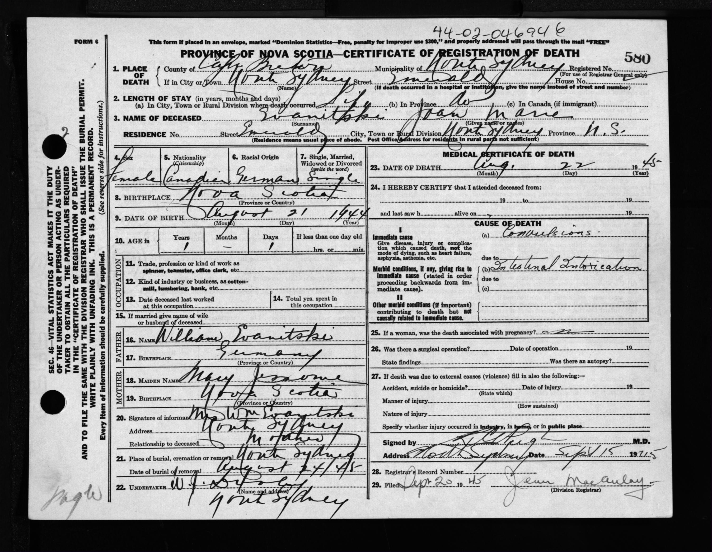 Female Death Registration: Year: 1945 file: 222 number: 580
