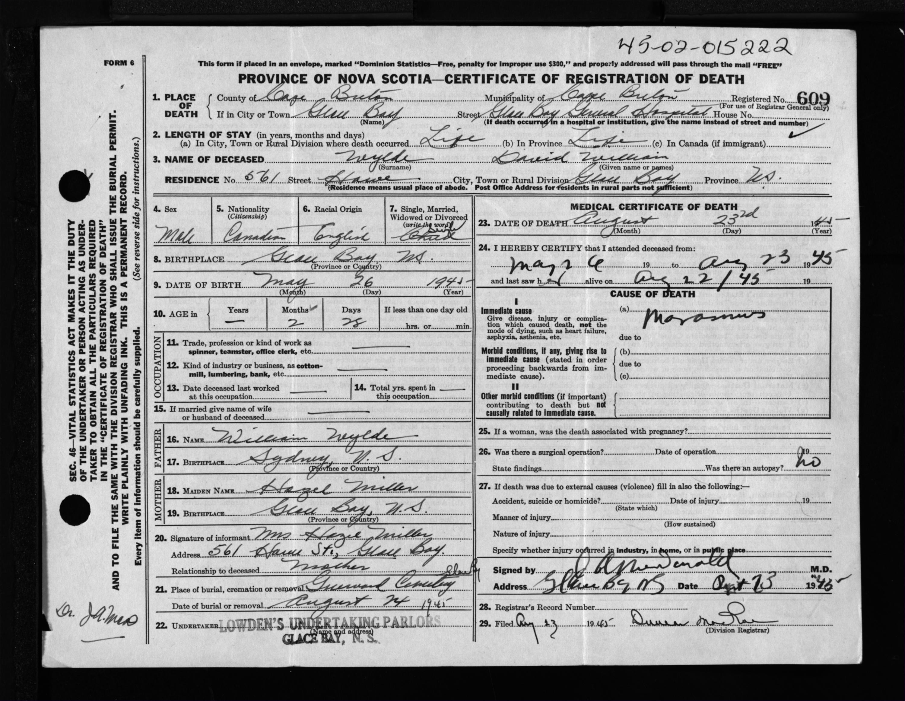Male Death Registration: Year: 1945 file: 222 number: 609