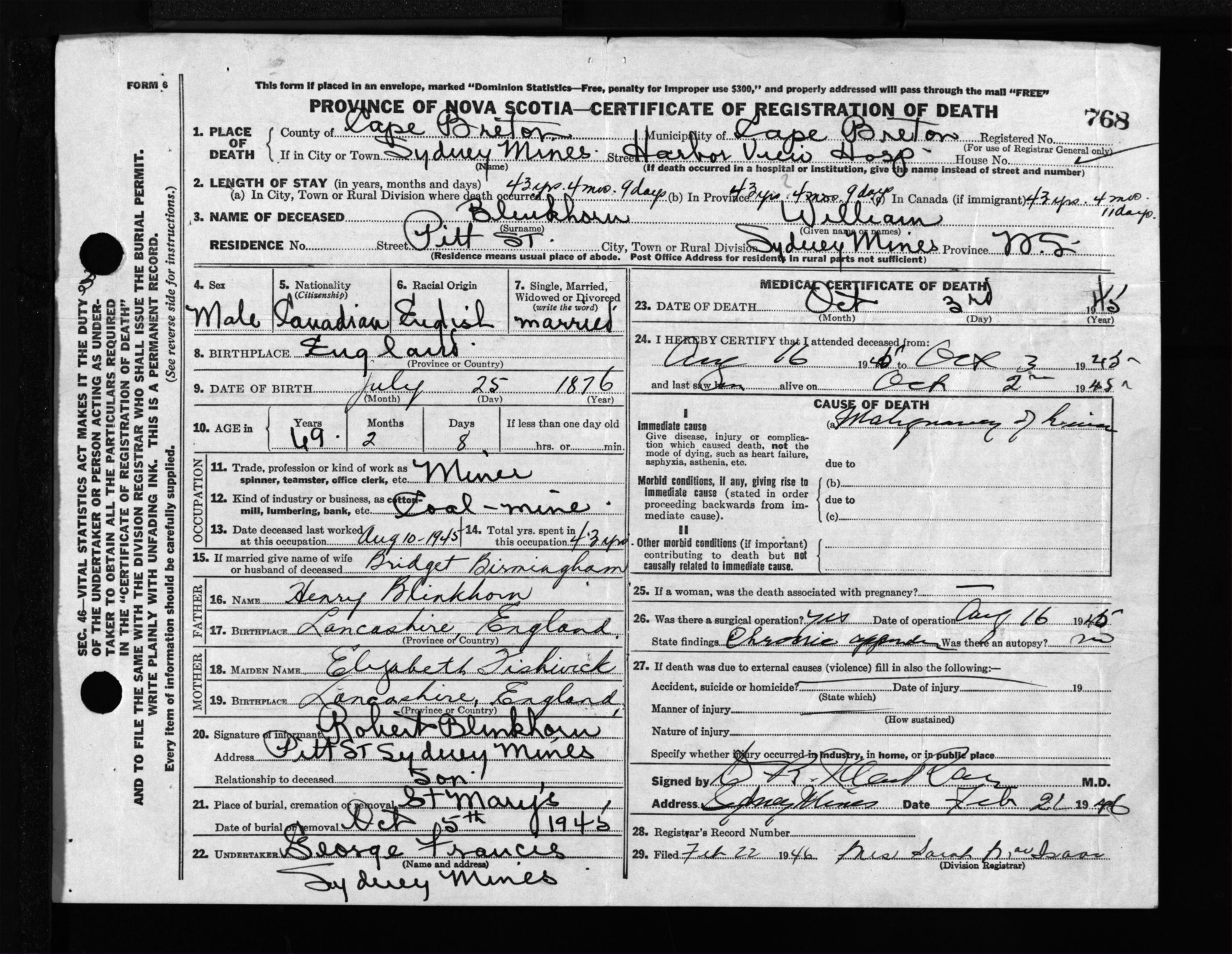 Male Death Registration: Year: 1945 file: 222 number: 768