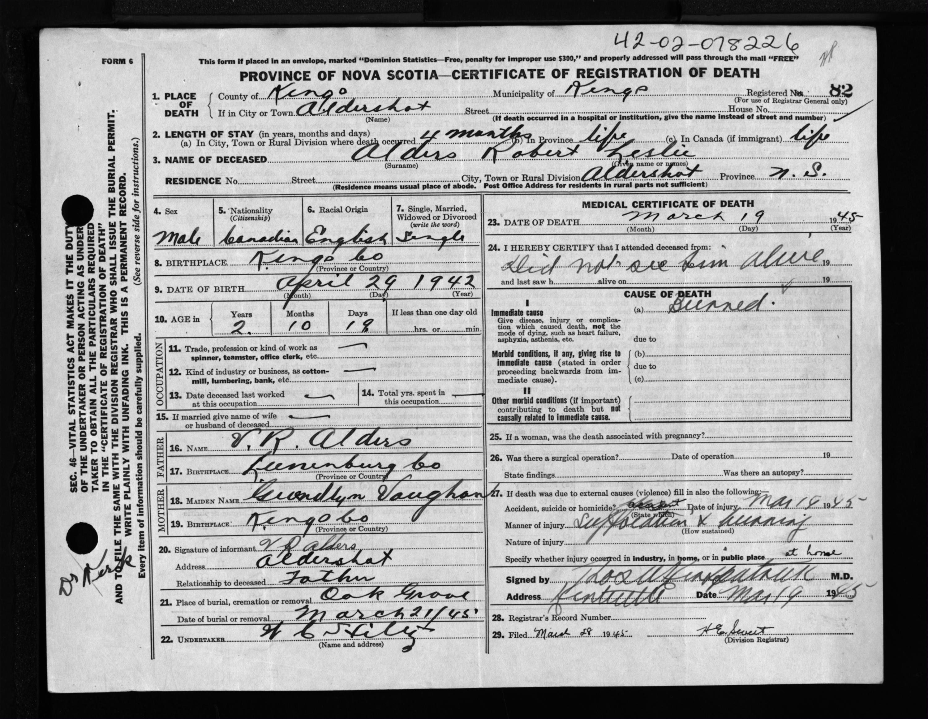 Male Death Registration: Year: 1945 file: 223 number: 82