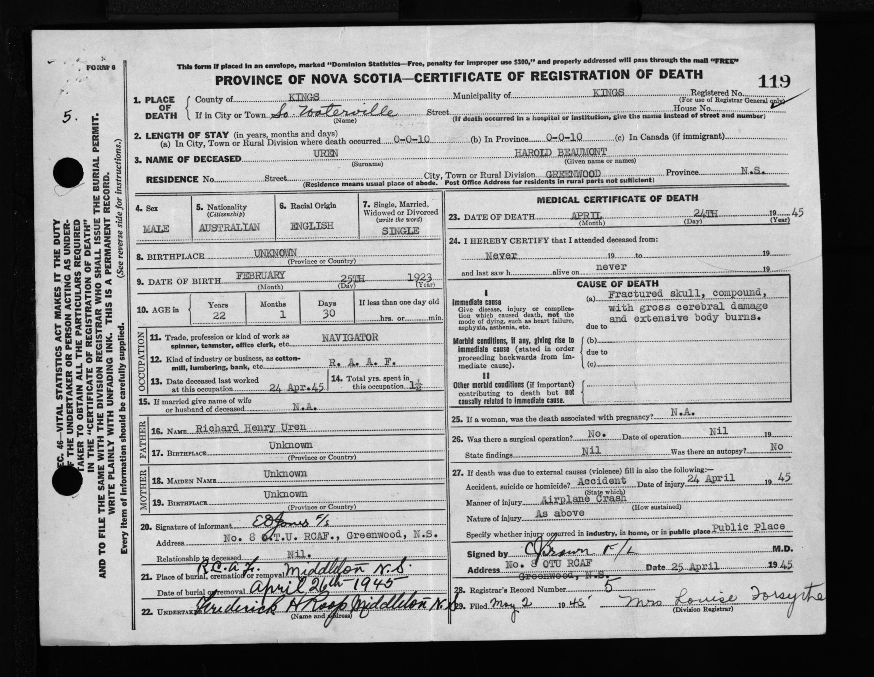 Male Death Registration: Year: 1945 file: 223 number: 119