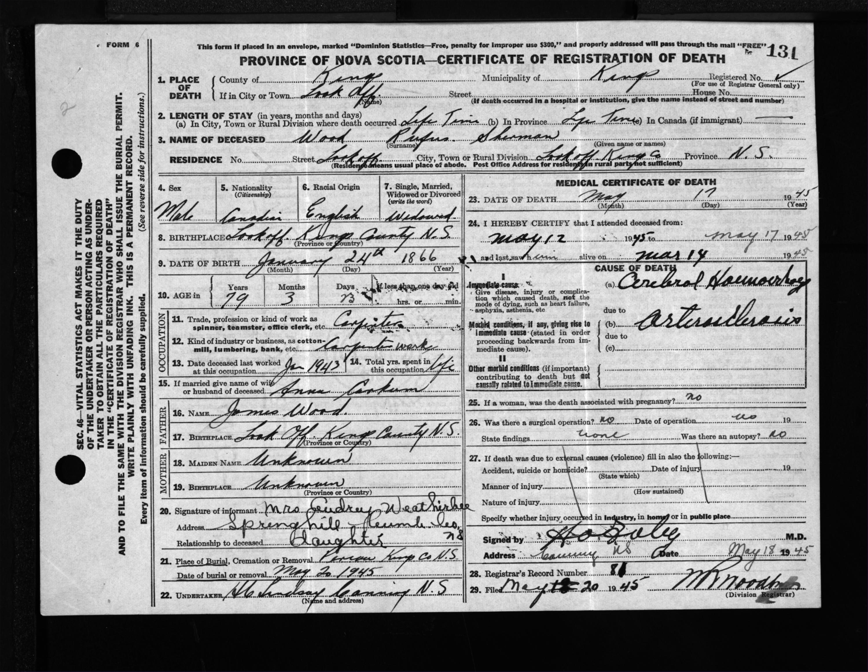 Male Death Registration: Year: 1945 file: 223 number: 131