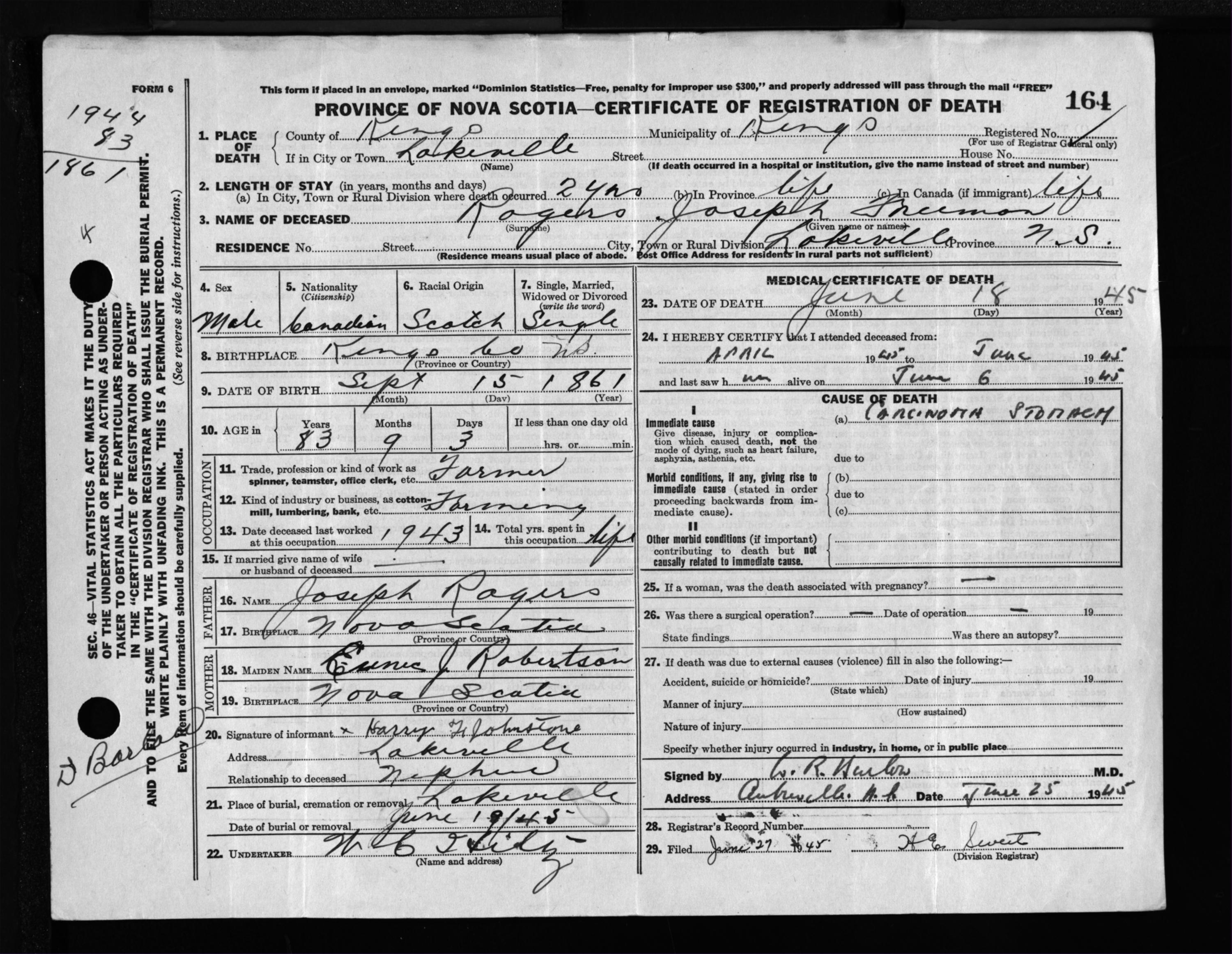 Male Death Registration: Year: 1945 file: 223 number: 164