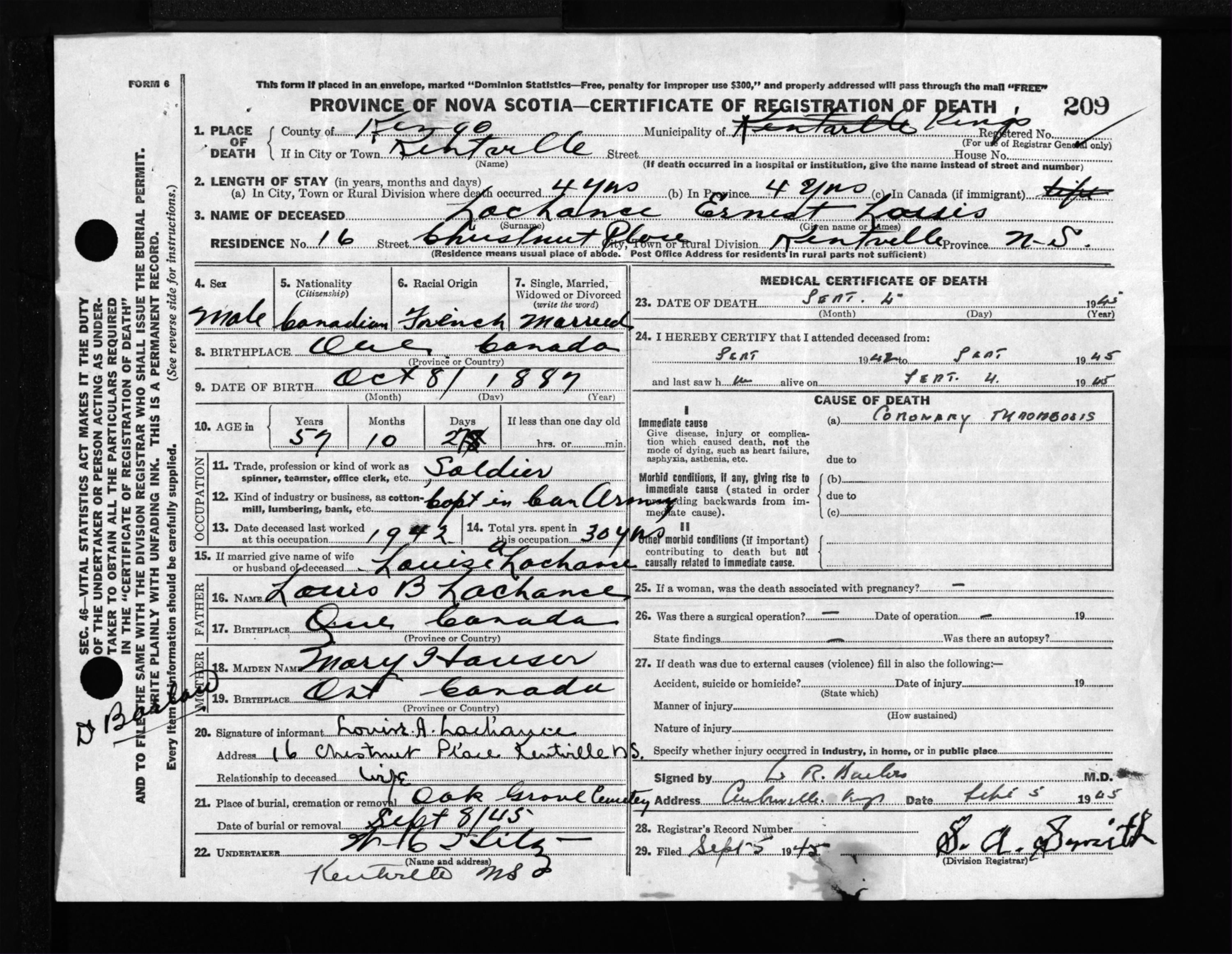 Male Death Registration: Year: 1945 file: 223 number: 209