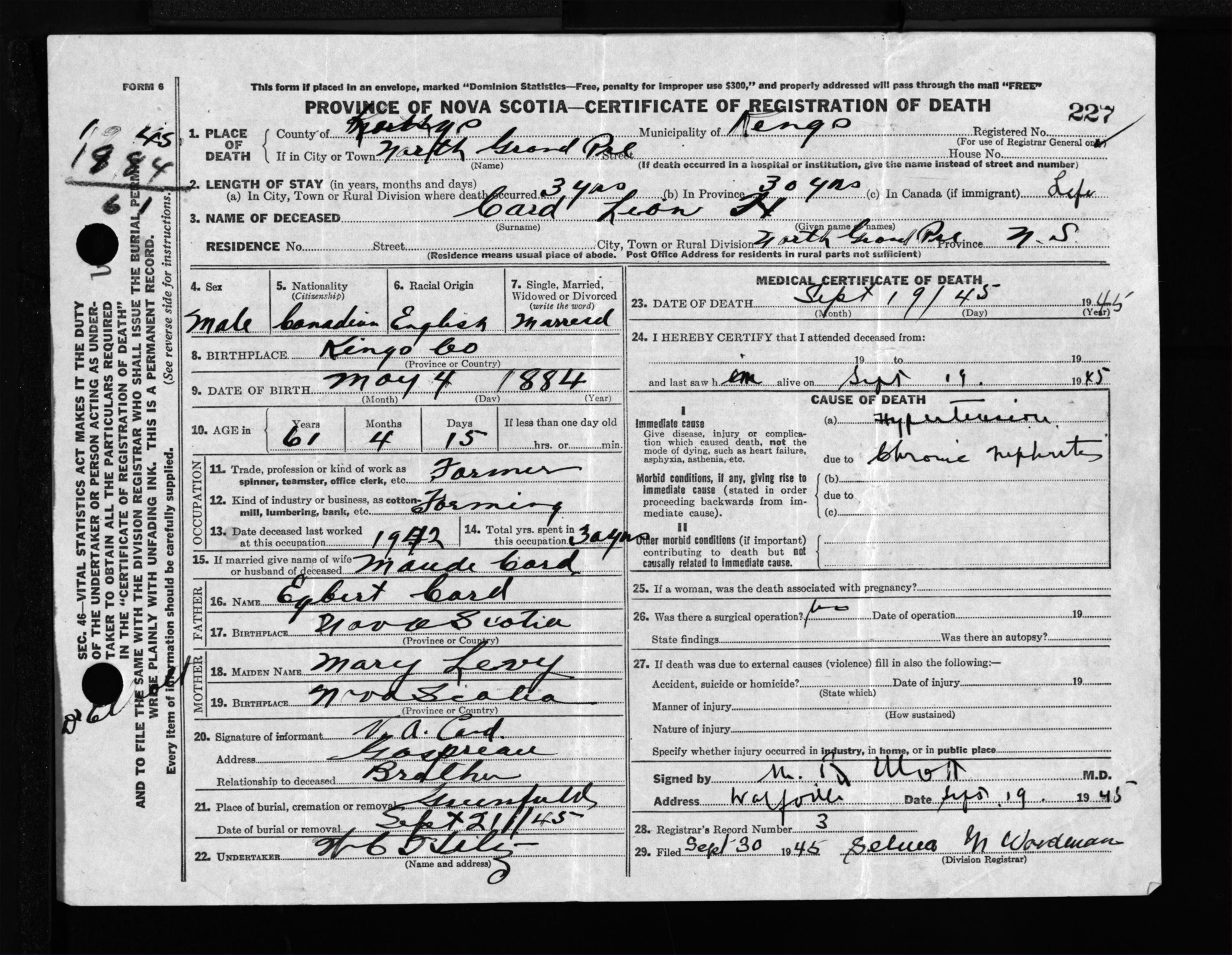 Male Death Registration: Year: 1945 file: 223 number: 227