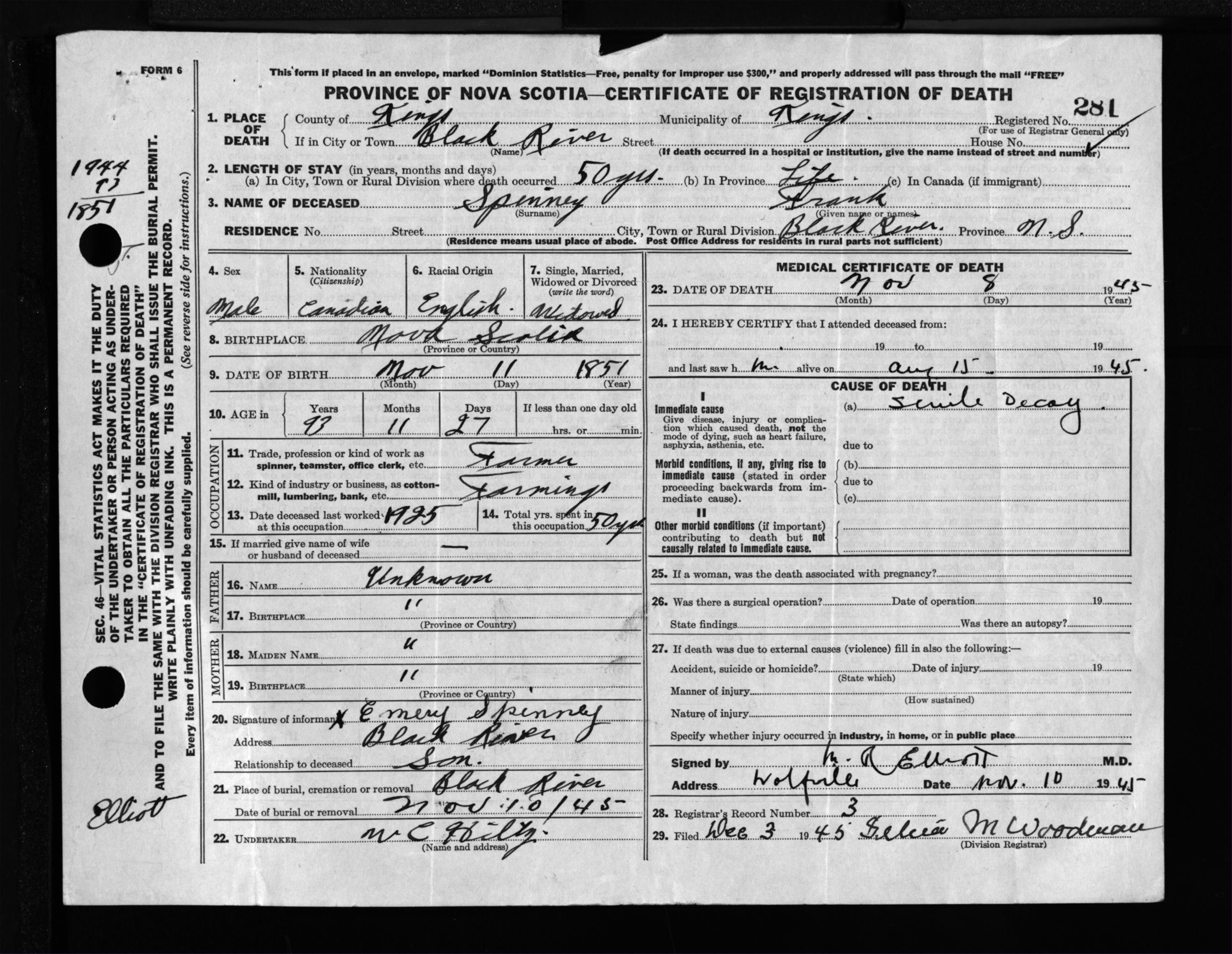 Male Death Registration: Year: 1945 file: 223 number: 281