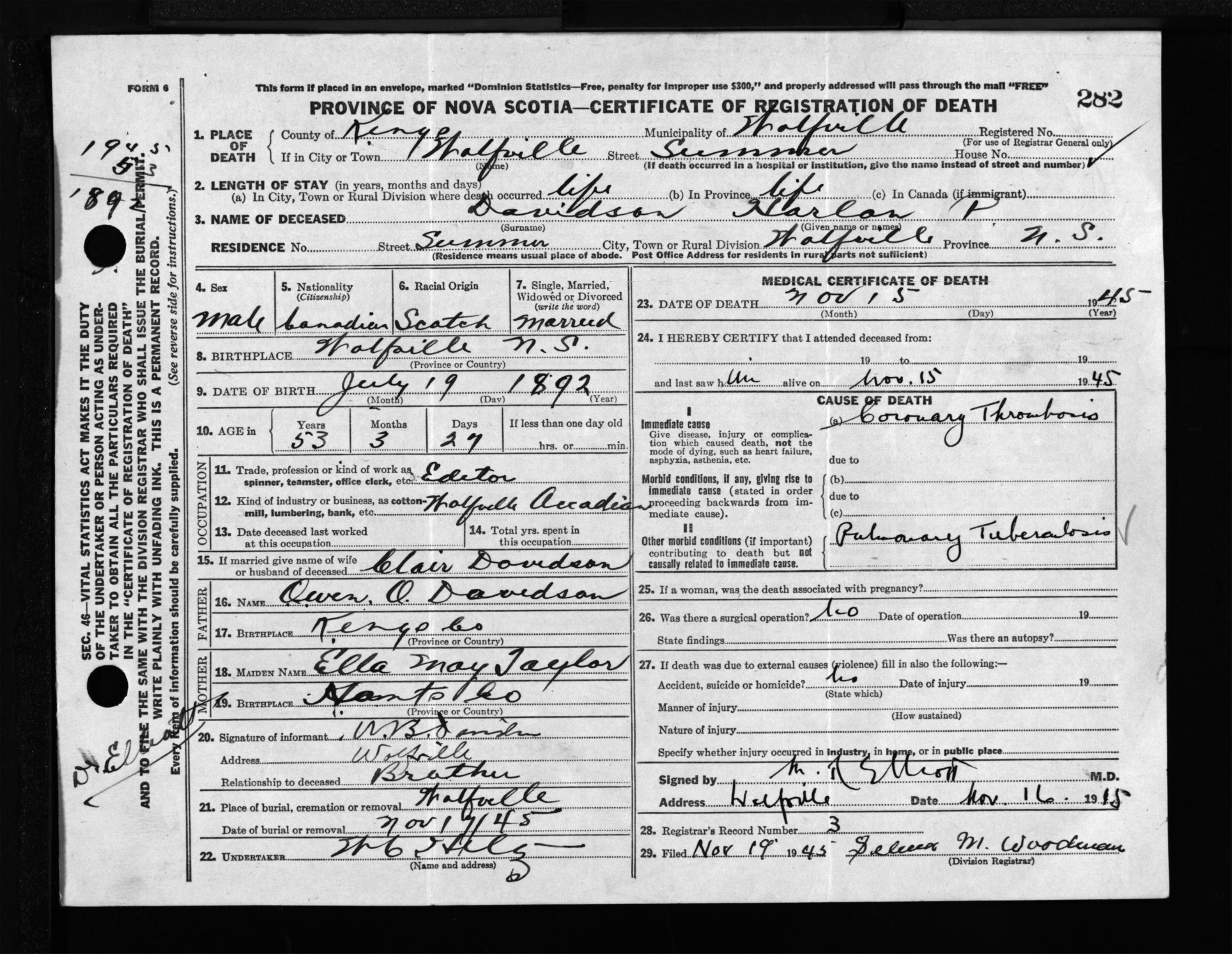 Male Death Registration: Year: 1945 file: 223 number: 282