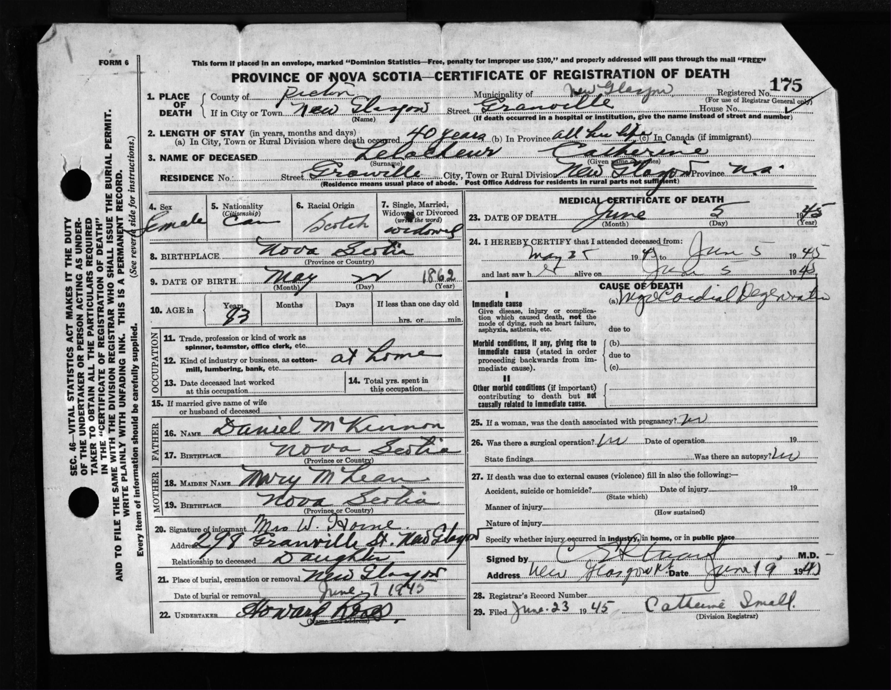 Female Death Registration: Year: 1945 file: 224 number: 175