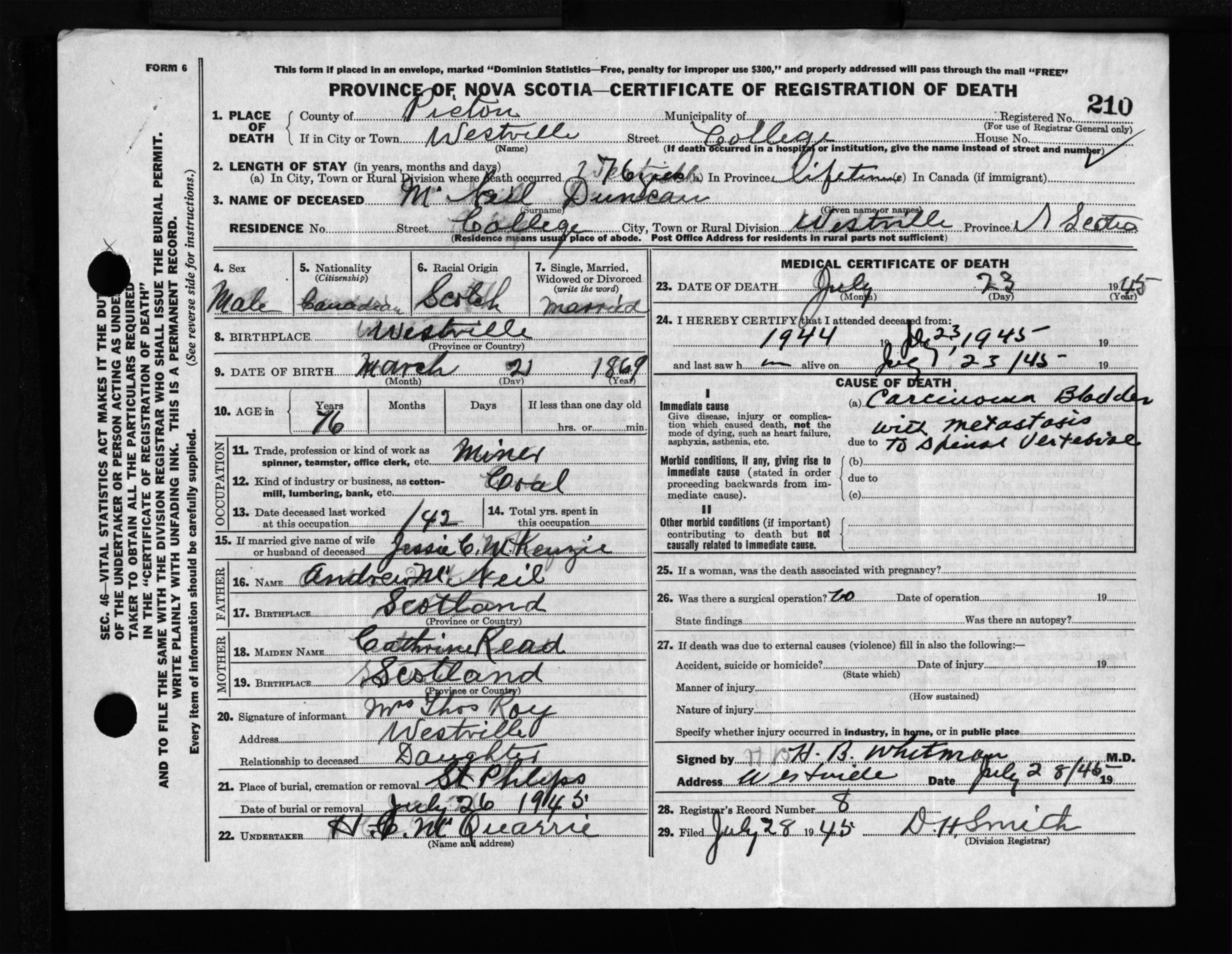 Male Death Registration: Year: 1945 file: 224 number: 210