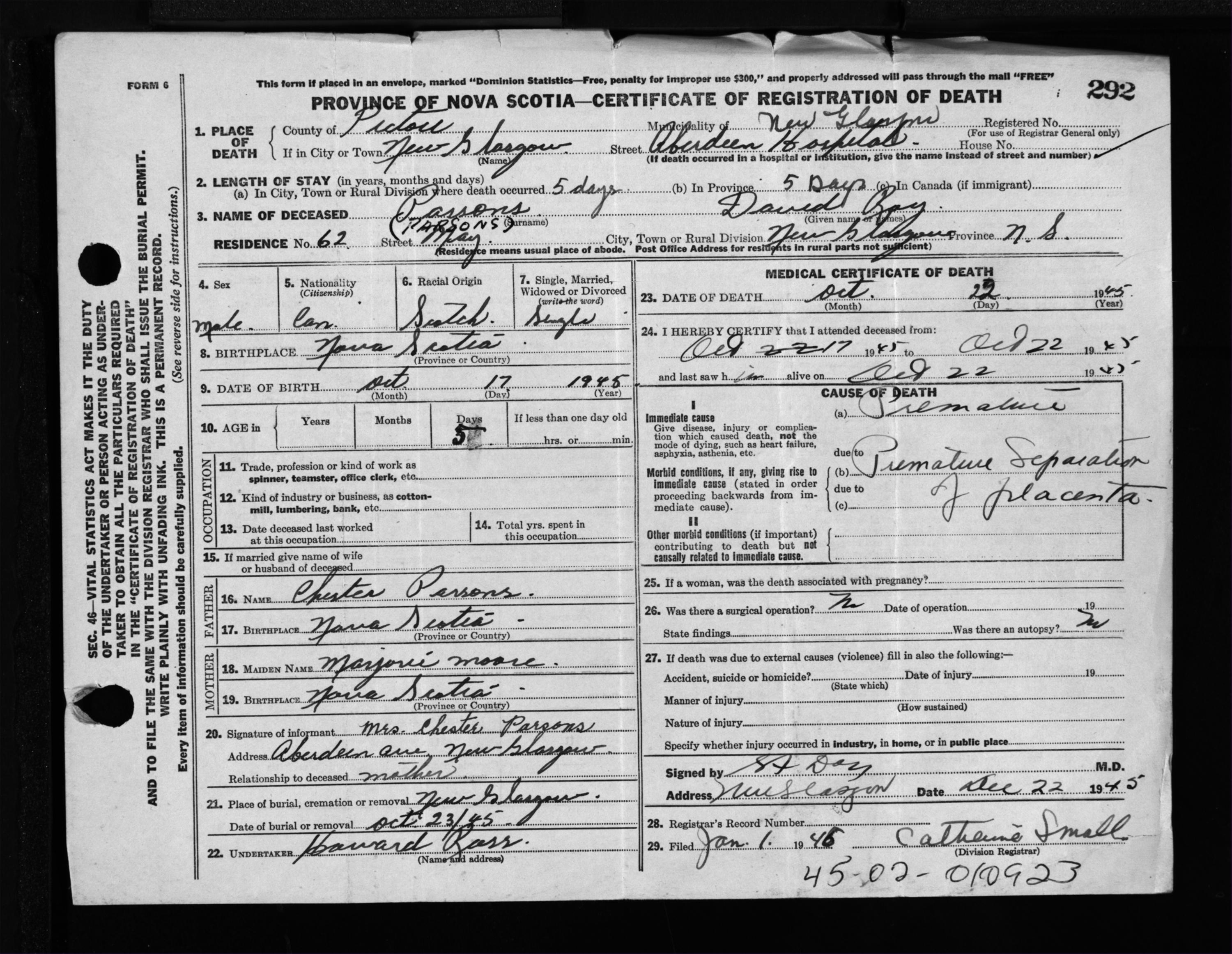 Male Death Registration: Year: 1945 file: 224 number: 292