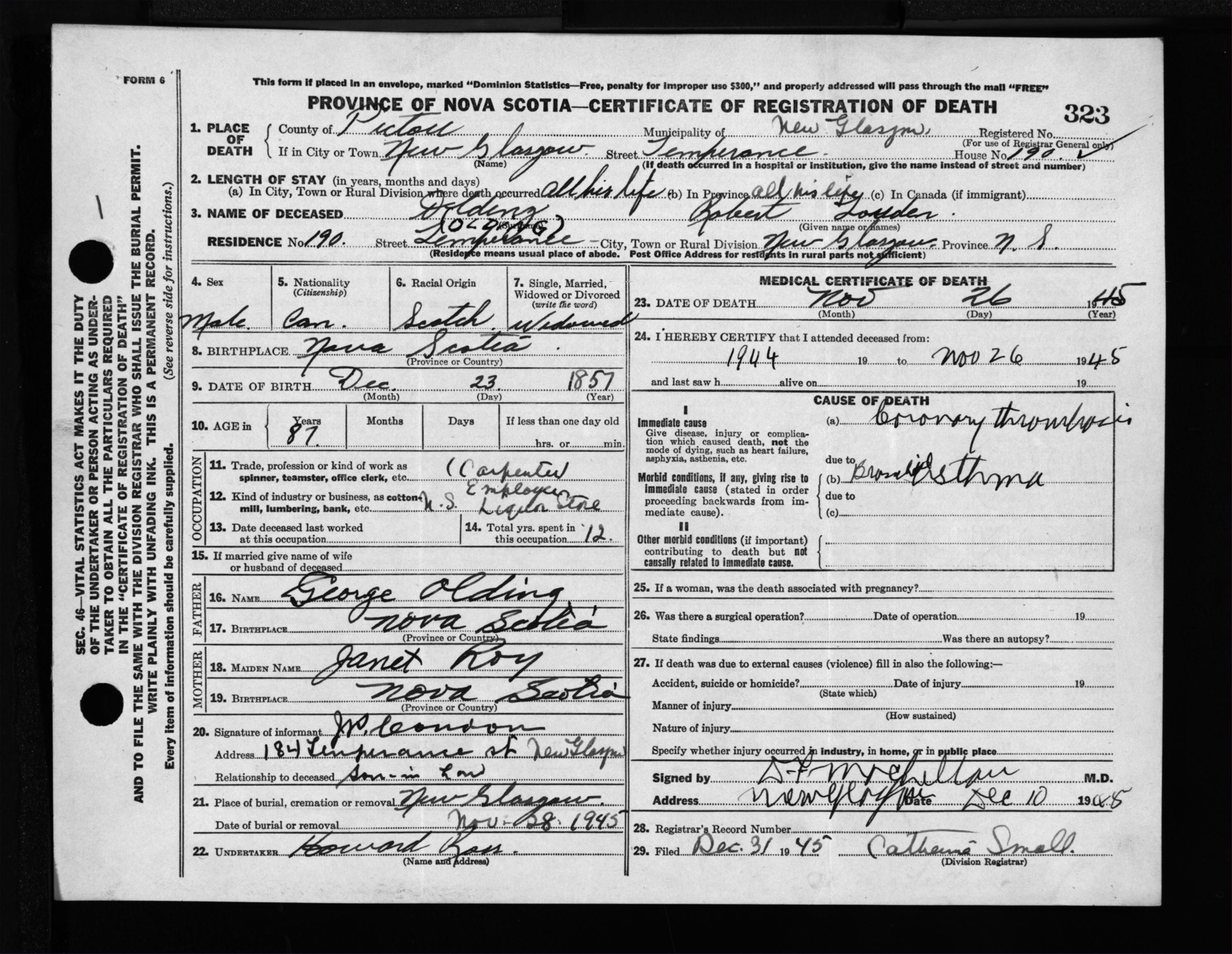 Male Death Registration: Year: 1945 file: 224 number: 323