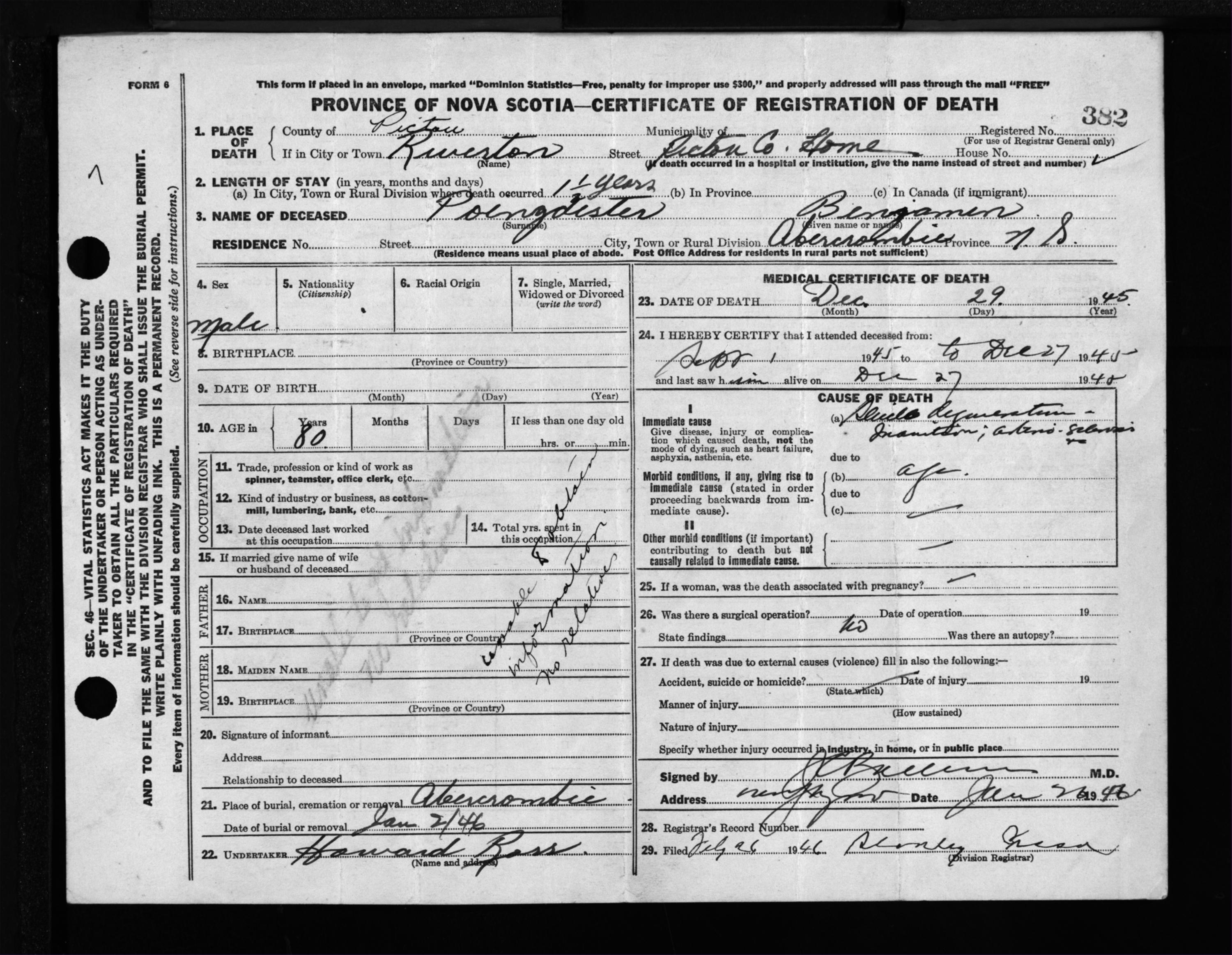 Male Death Registration: Year: 1945 file: 224 number: 382