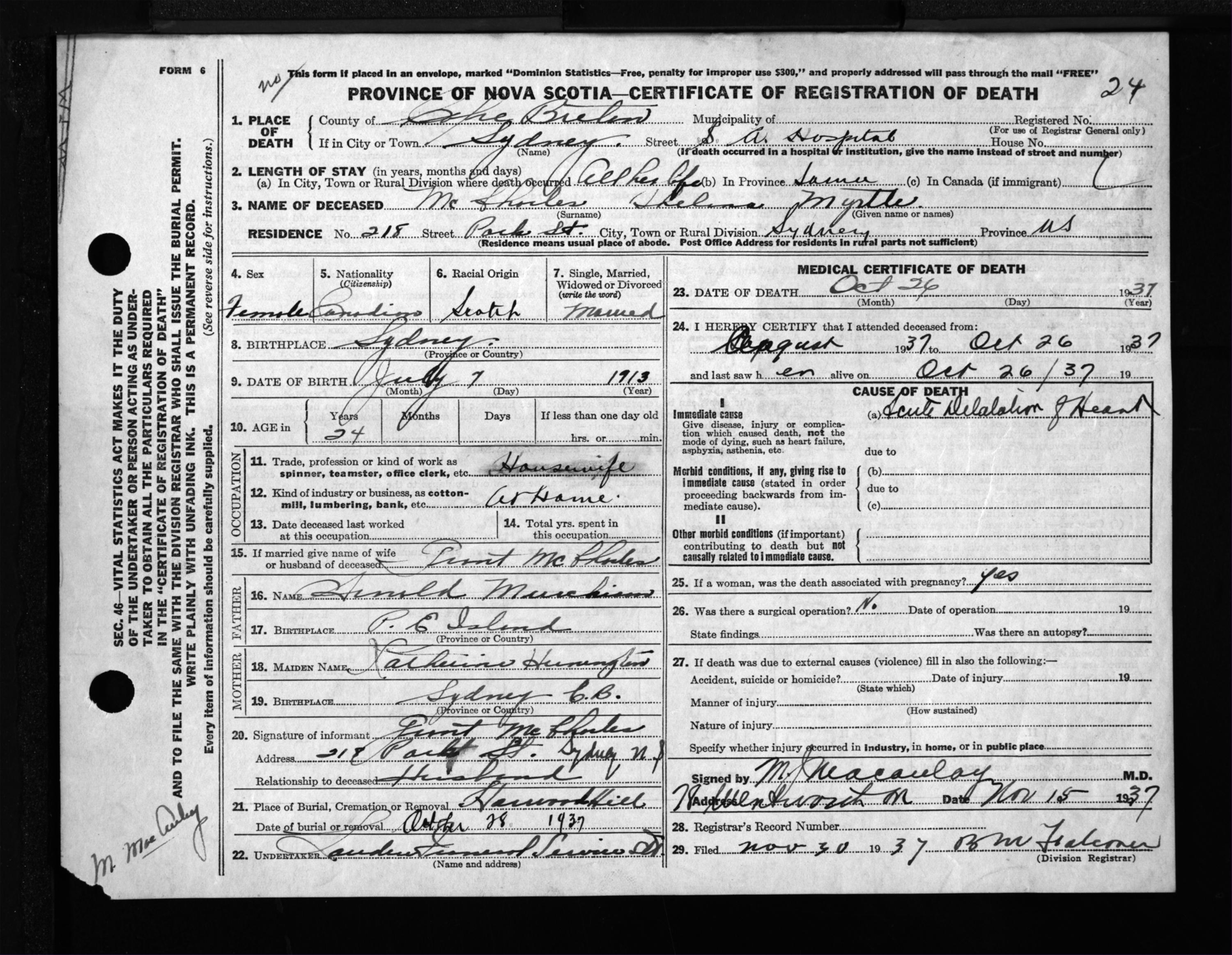 Female Death Registration: Year: 1937 file: 298 number: 24