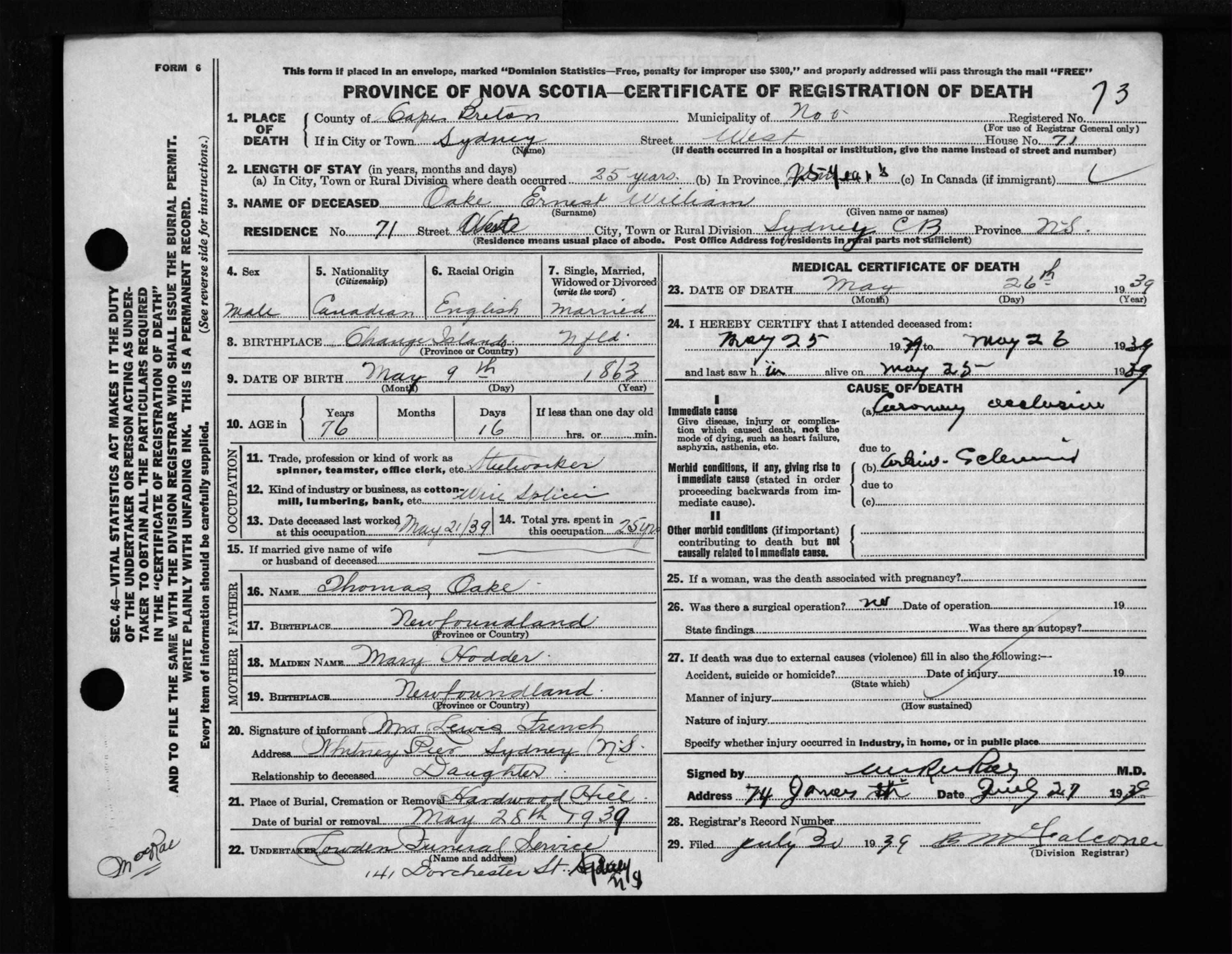 Male Death Registration: Year: 1939 file: 298 number: 73
