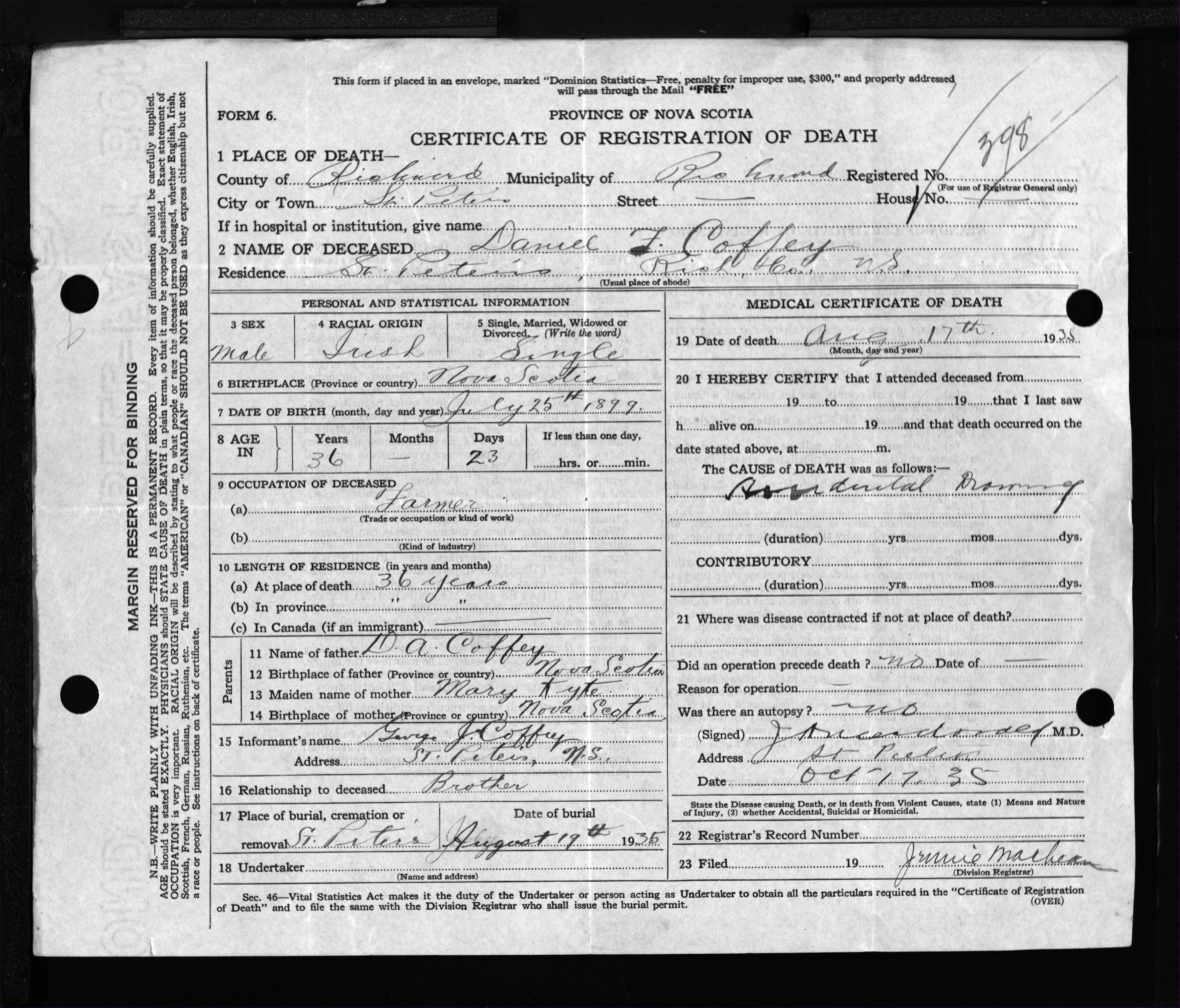 Male Death Registration: Year: 1935 file: 300 number: 398
