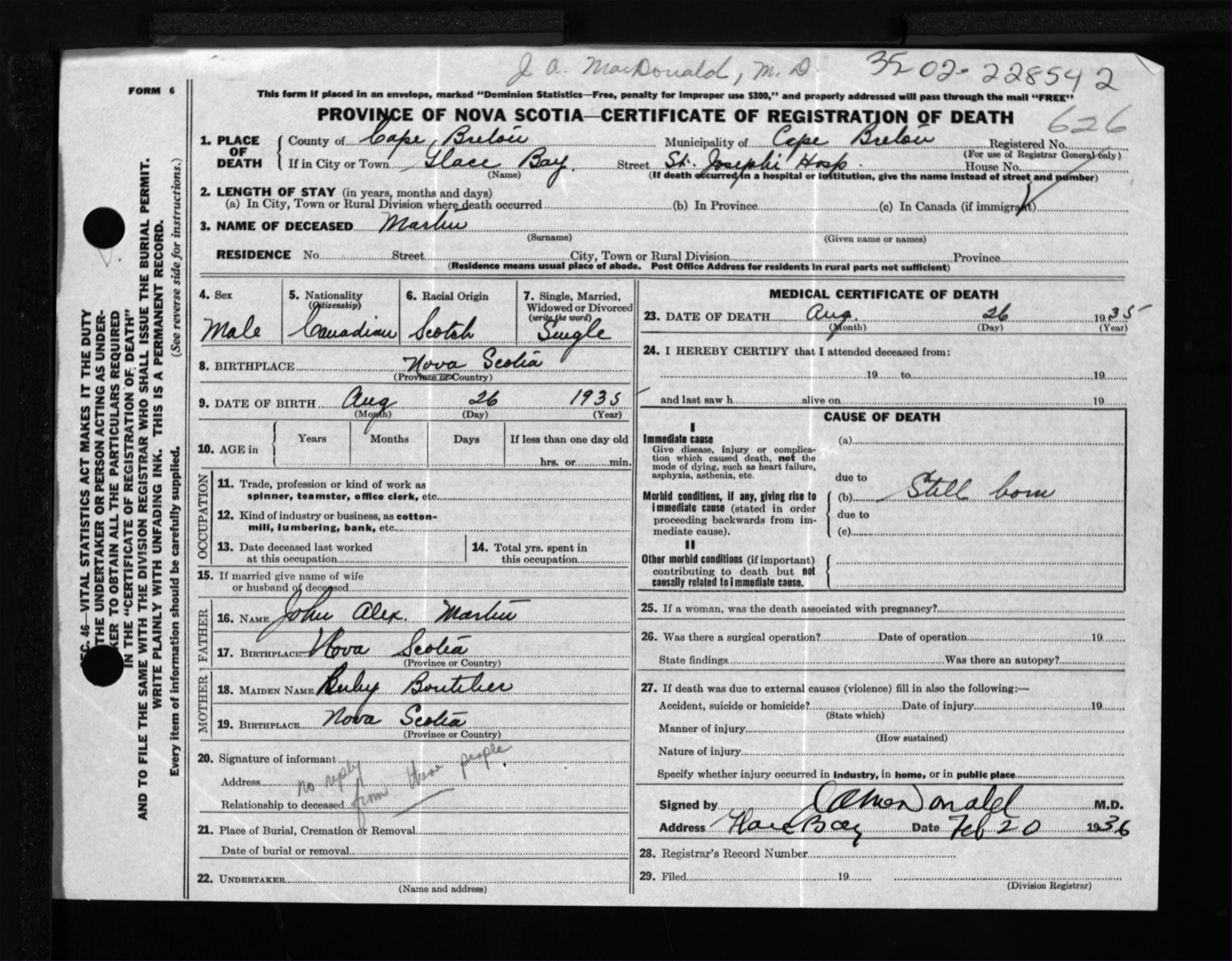 Male Death Registration: Year: 1935 file: 300 number: 626
