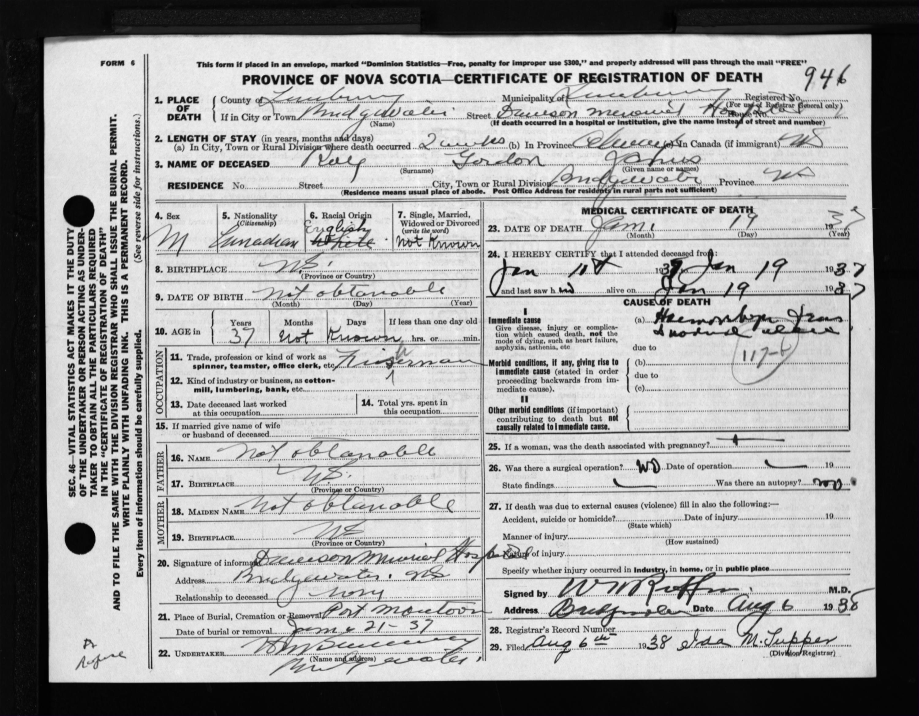 Male Death Registration: Year: 1937 file: 300 number: 946