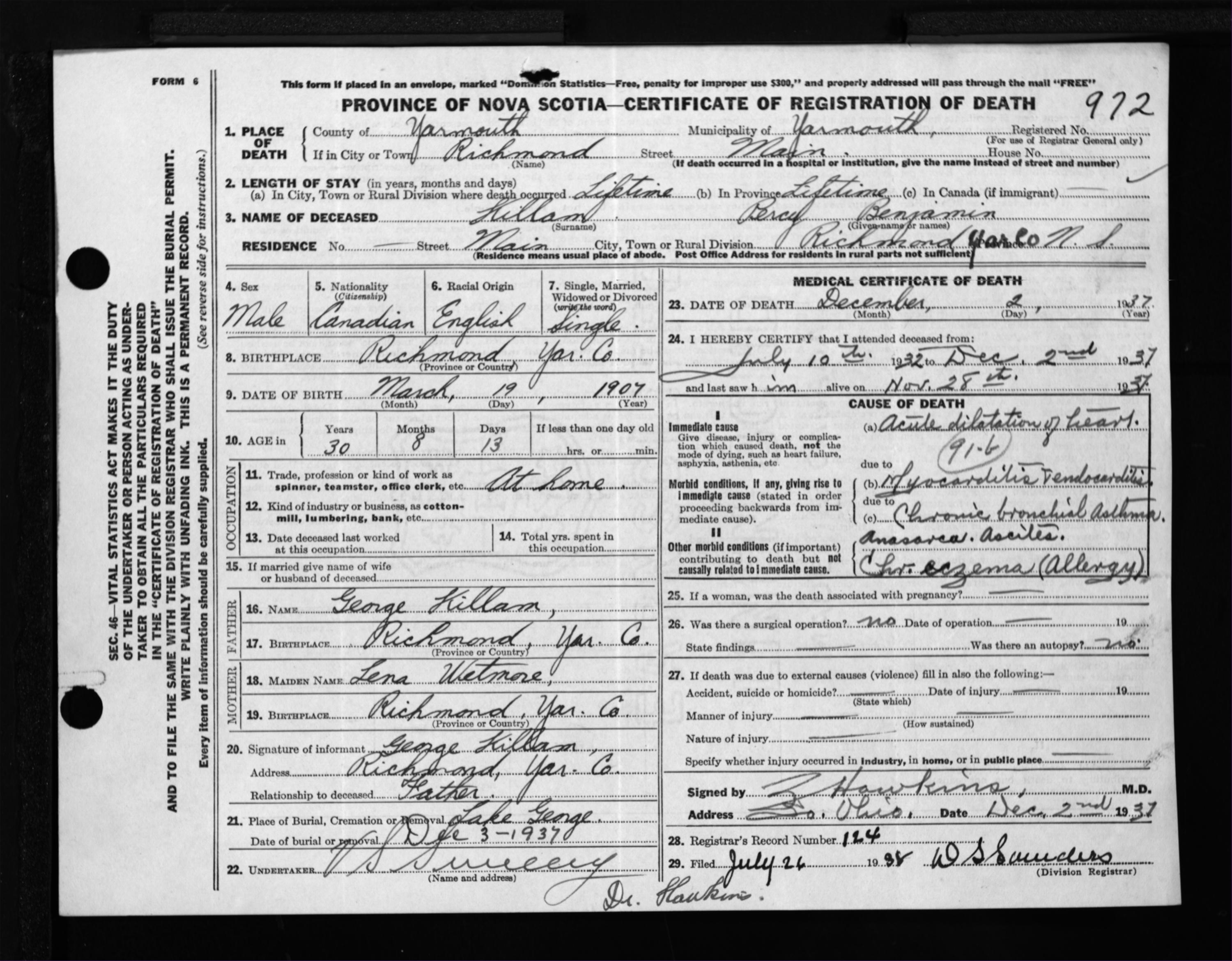 Male Death Registration: Year: 1937 file: 300 number: 972
