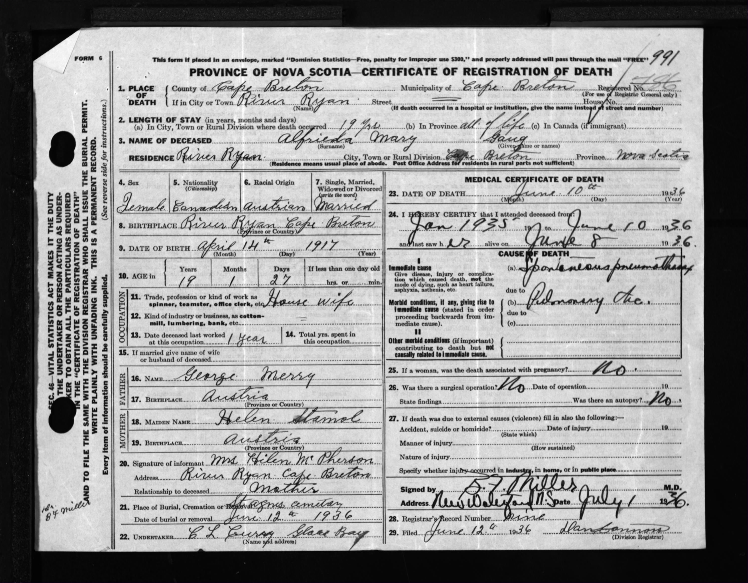 Female Death Registration: Year: 1936 file: 300 number: 991