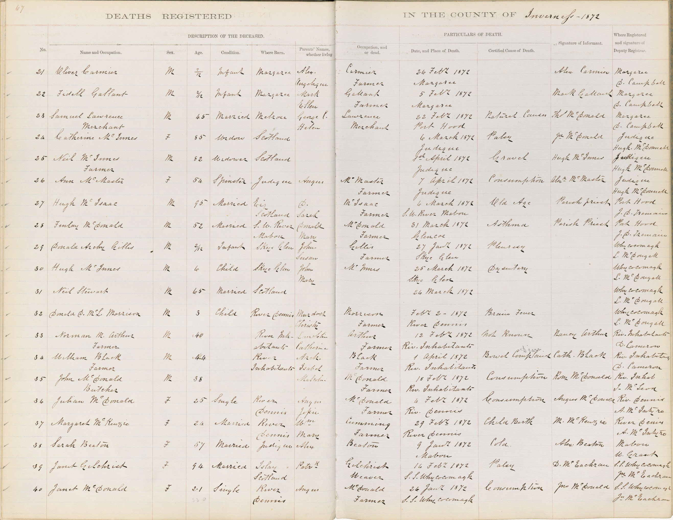 Death Registration: Year: 1872 book: 1810 page: 67 number: 21