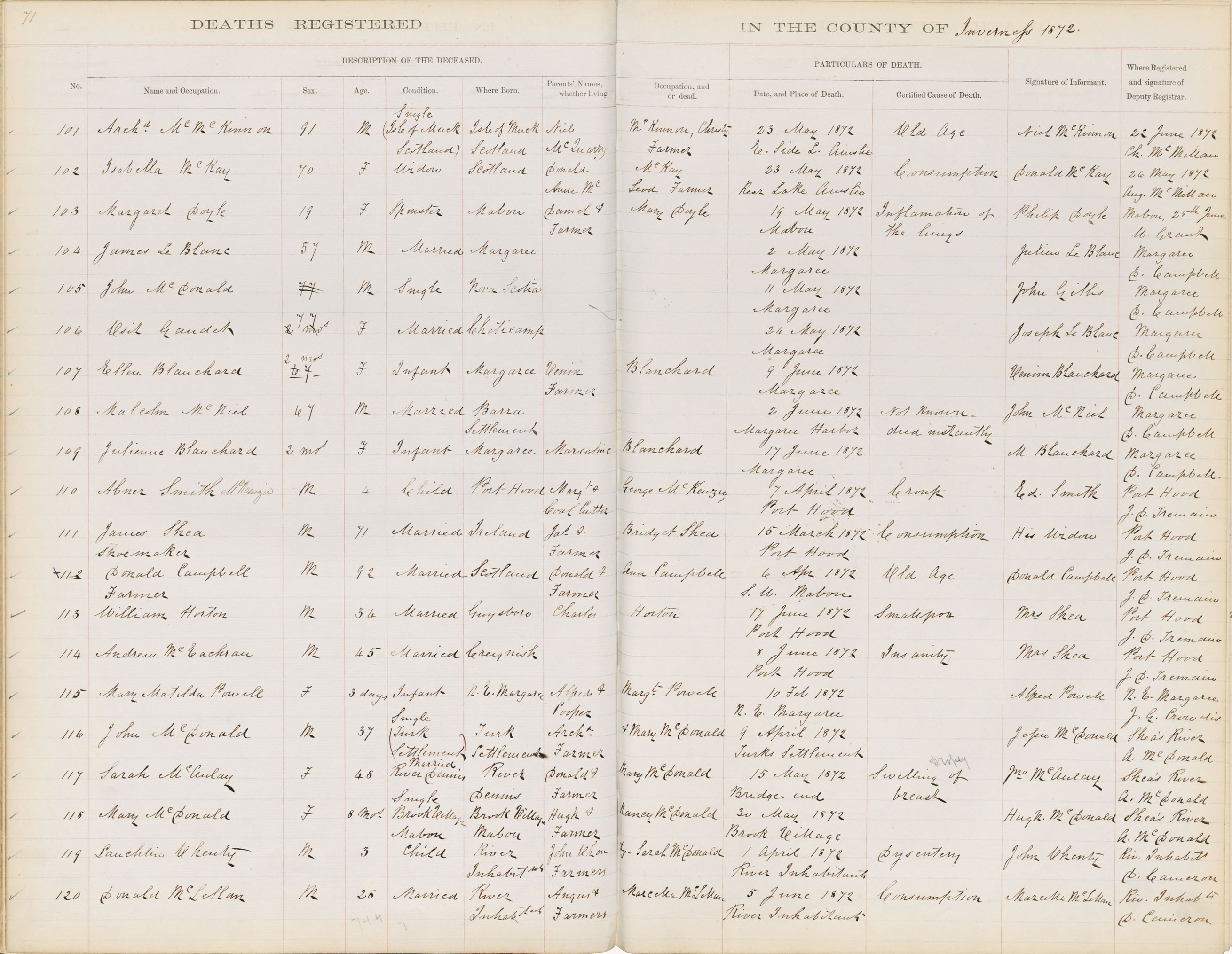 Death Registration: Year: 1872 book: 1810 page: 71 number: 101