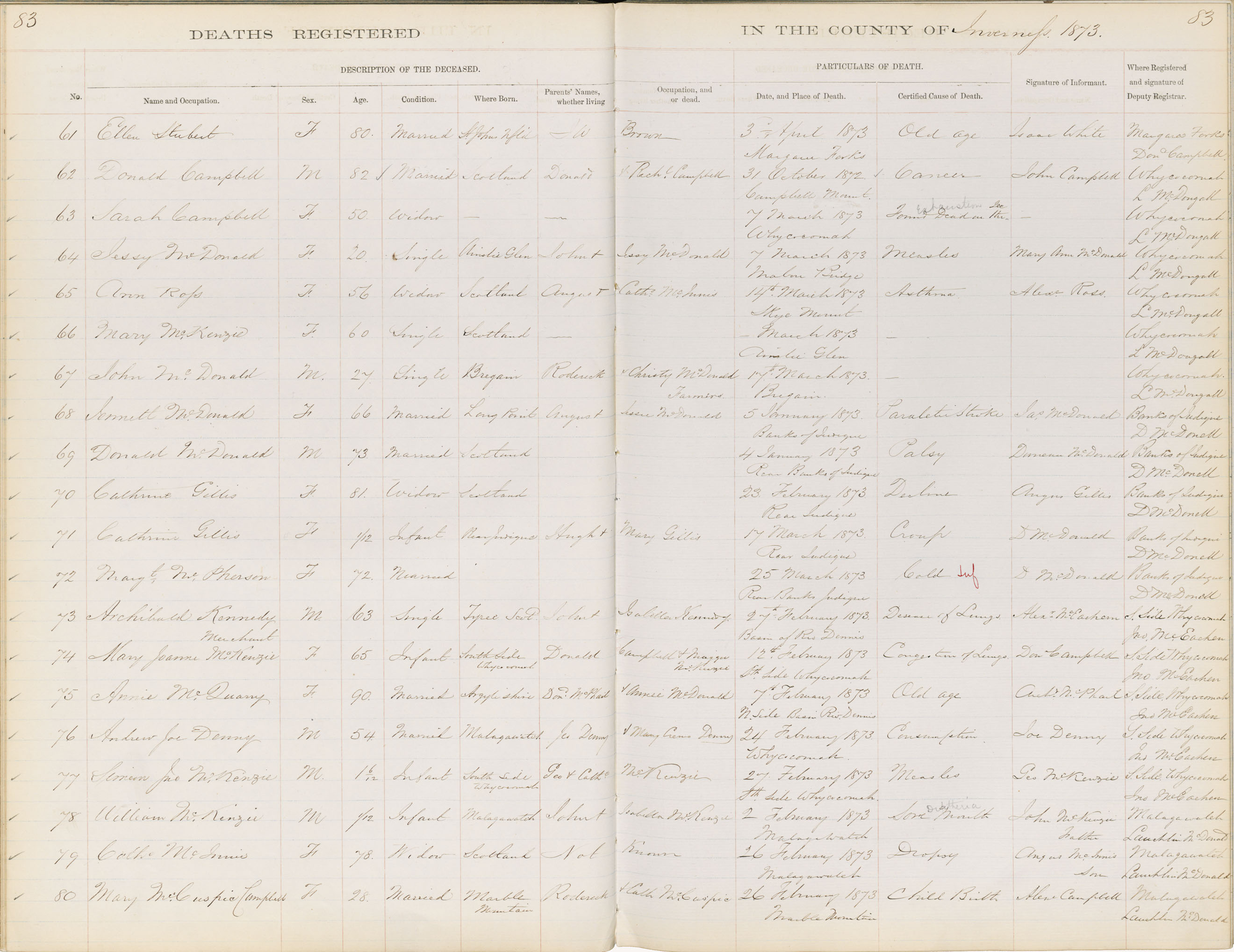 Death Registration: Year: 1873 book: 1810 page: 83 number: 80
