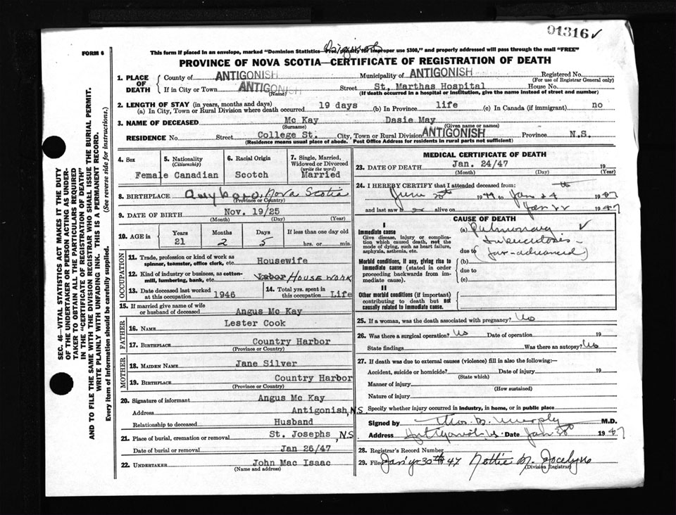 Female Death Registration: Year: 1947 number: 1316