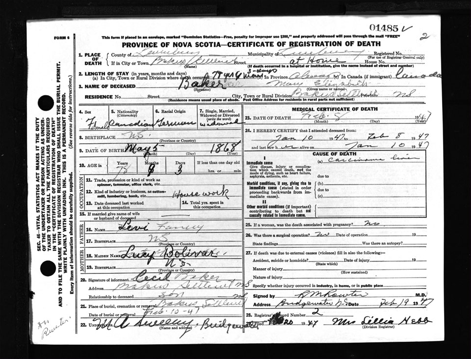 Female Death Registration: Year: 1947 number: 1485