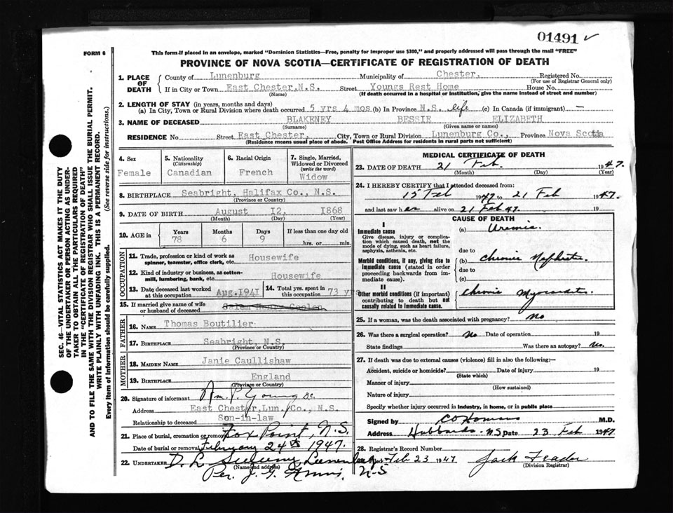 Female Death Registration: Year: 1947 number: 1491