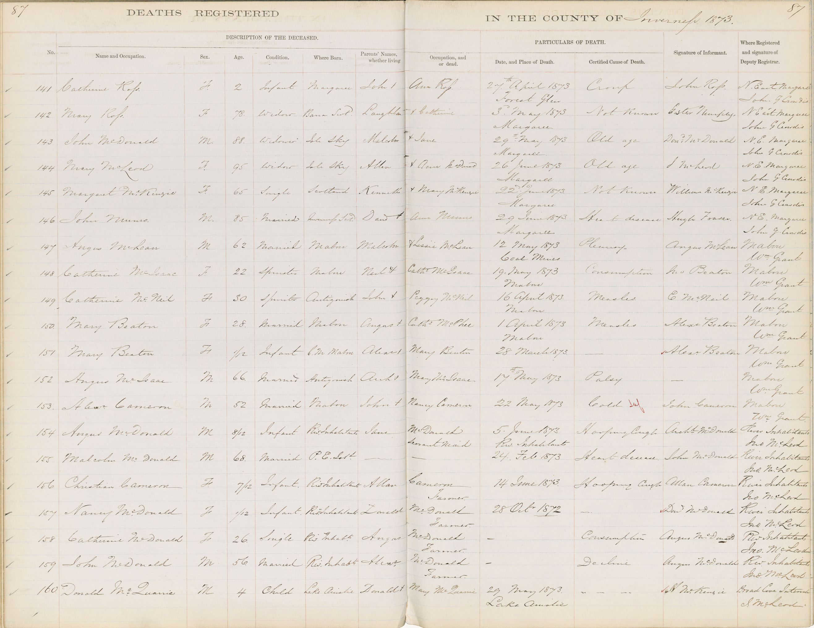 Death Registration: Year: 1873 book: 1810 page: 87 number: 160