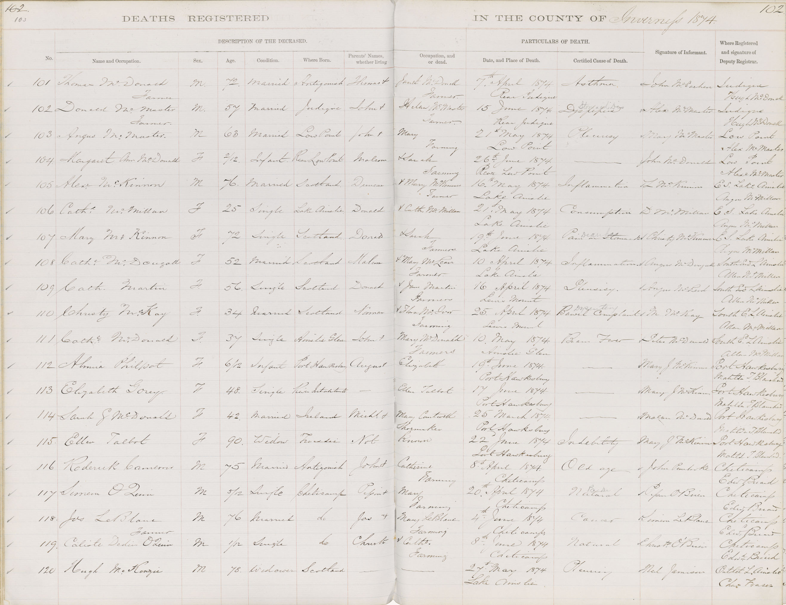 Death Registration: Year: 1874 book: 1810 page: 103 number: 101
