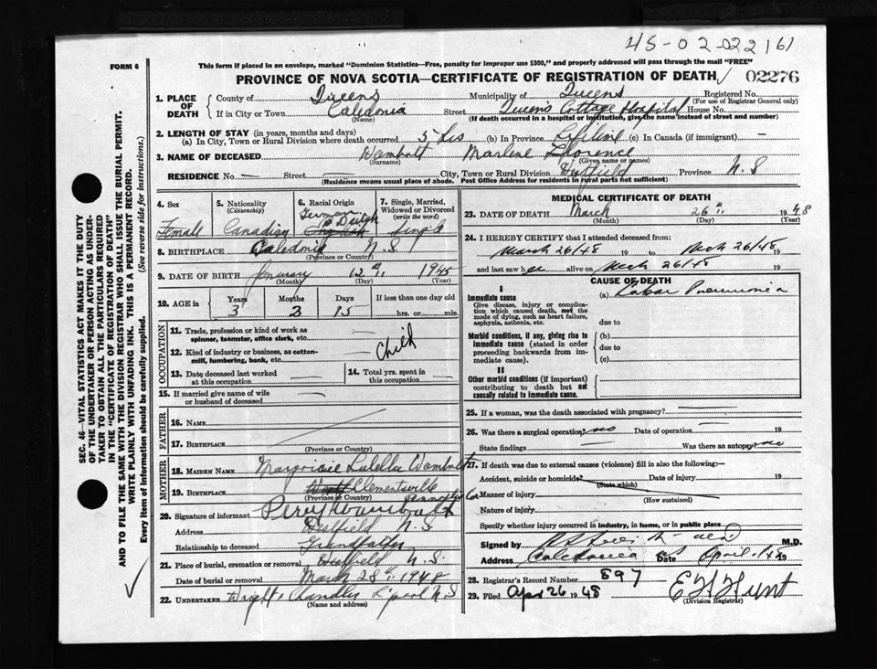 Female Death Registration: Year: 1948 number: 2276